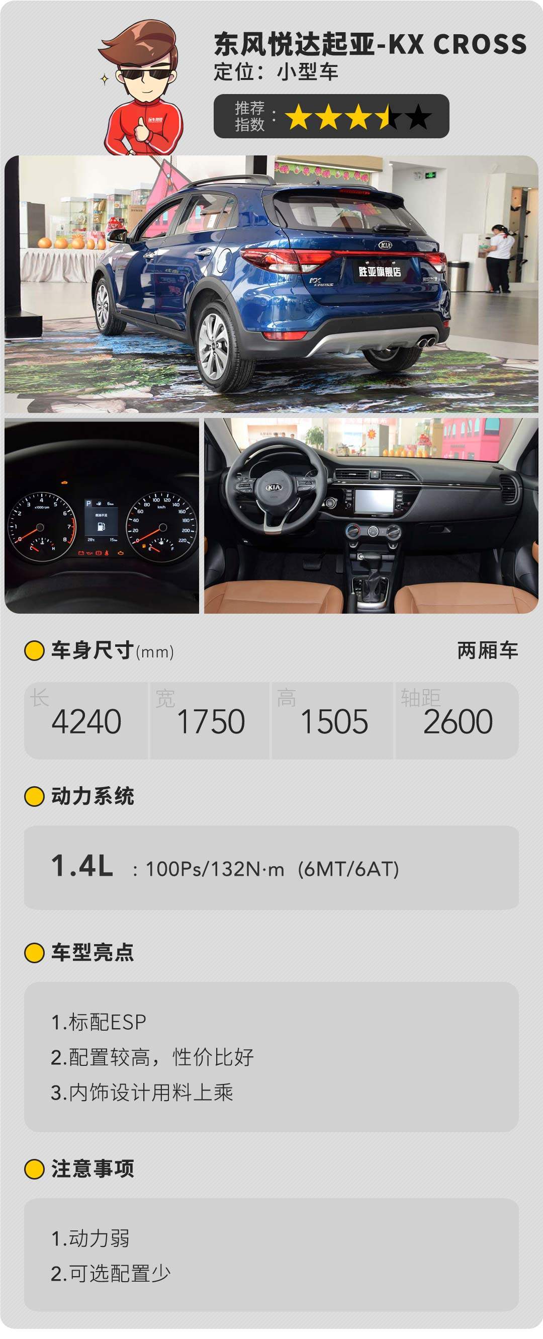 推荐理由:起亚的KX CROSS基于起亚K2打造而来。KX CROSS稍微加高了底盘,最低离地间隙达到了175mm,完全不必担心通过性的问题。KX CROSS延续了韩系车一贯高性价比的特点,配置非常高。例如ESP、刹车辅助、后驻车雷达、上坡辅助、后视镜加热这些配置都是全系标配。要知道,这款车售价仅7.49万起,价格还能小刀。