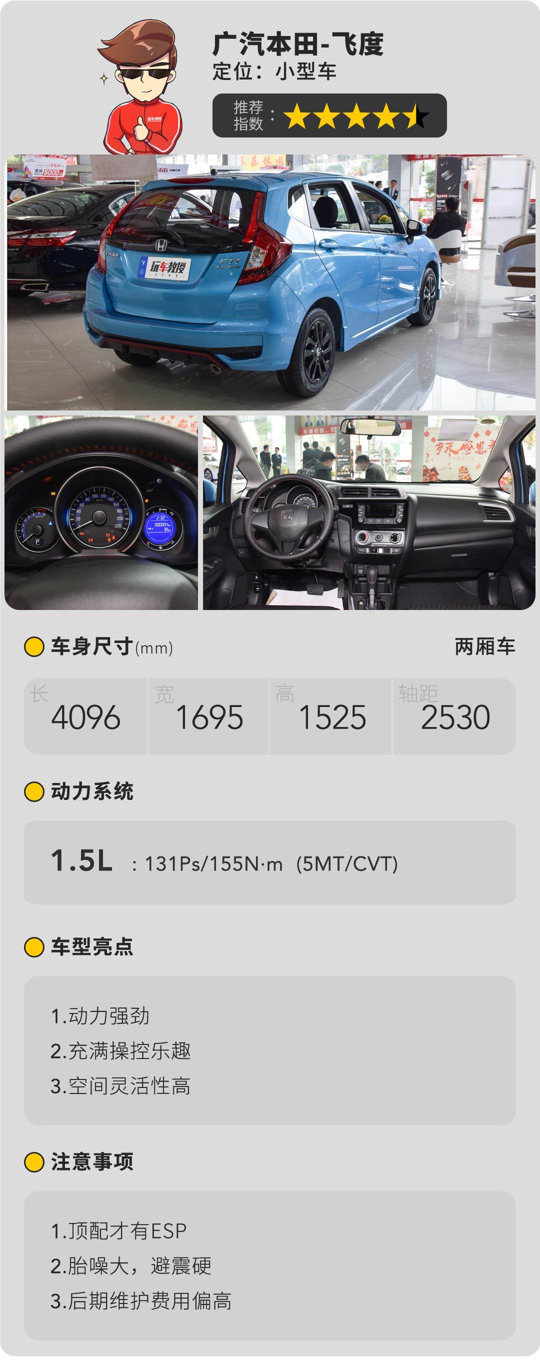推荐理由:说起两厢车,国内最热的两厢车应该就是本田飞度了。一台131匹马力的1.5L地球梦直喷发动机塞进飞度这个小身躯,立刻变成了超跑GK5。论起实用,不要看本田飞度顶着GK5超跑的称号,要实用起来可一点不比其他车型差。飞度的后排座椅有着魔术座椅的称号,后排坐垫可以翻起来,空间组合更加灵活。