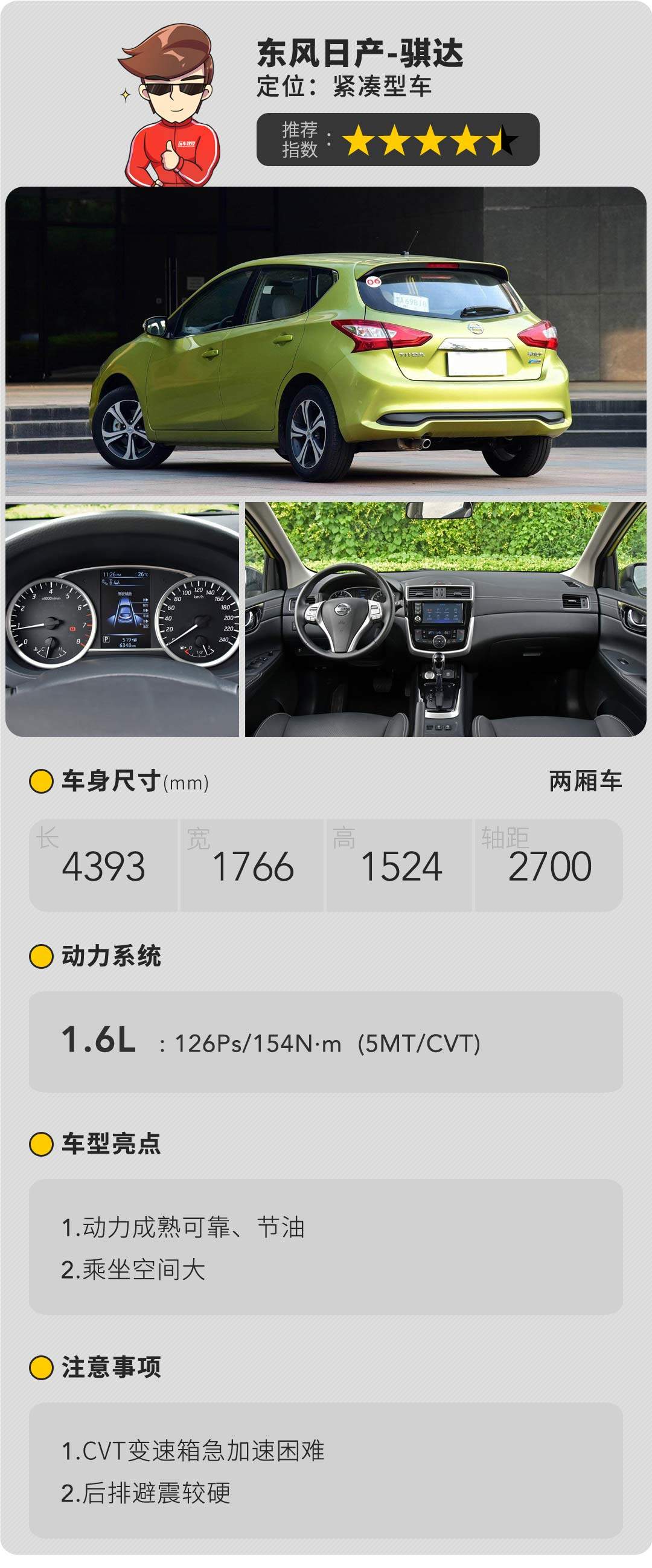 推荐理由:日产骐达在我国也是一款很受欢迎的两厢车。型号为HR16的1.6L发动机已经在日产上使用了十几年,成熟可靠。匹配的CVT变速箱让骐达更平顺、更节油。当然,骐达之所以成为国民两厢车,离不开它宽敞的乘坐空间。