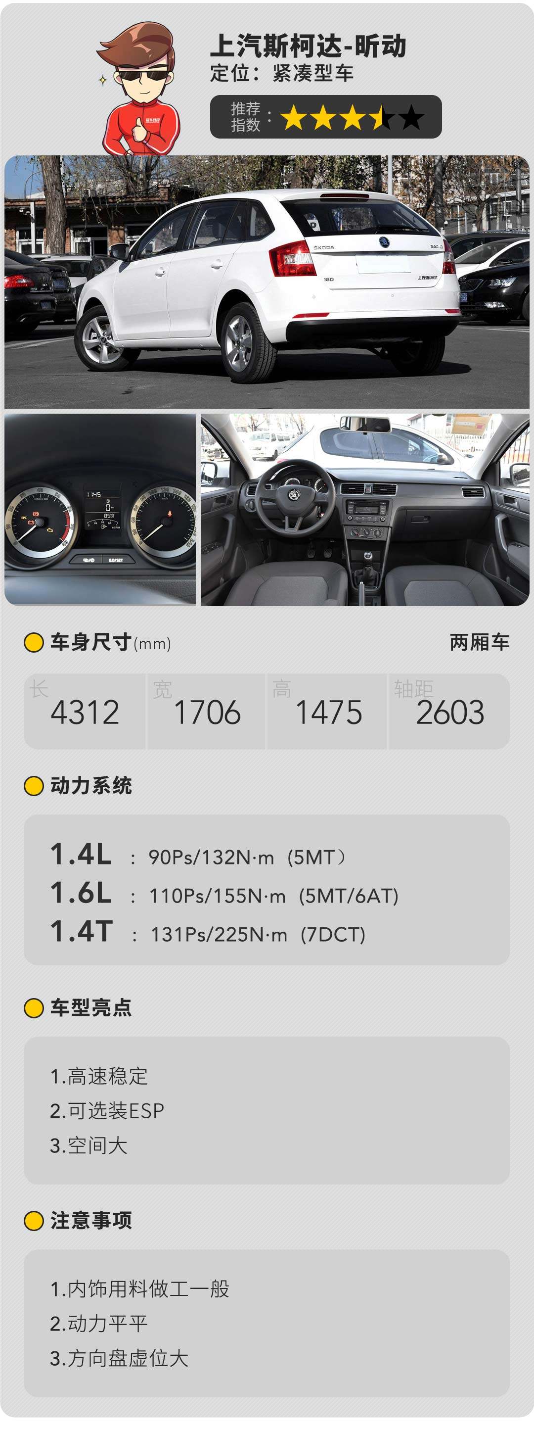 推荐理由:斯柯达昕动的定位是一款紧凑型两厢车,所以尺寸方面要比前面两款要大不少,不过售价并没有高他们一级,所以昕动是非常值得买的。昕动的配置不高,不过有些比较关键的配置可以选装,例如ESP。最重要的是,昕动采用大众集团的动力总成,在油耗、动力和可靠性方面不用担心。