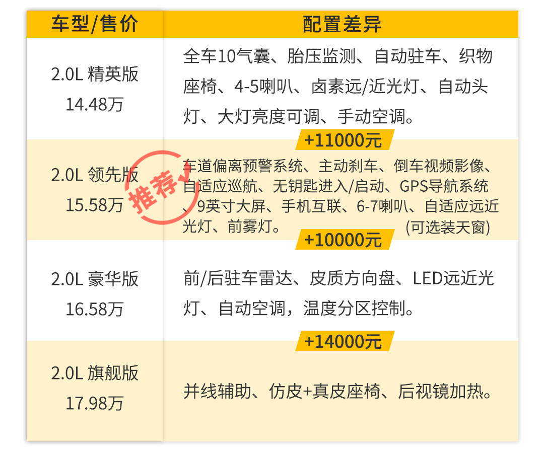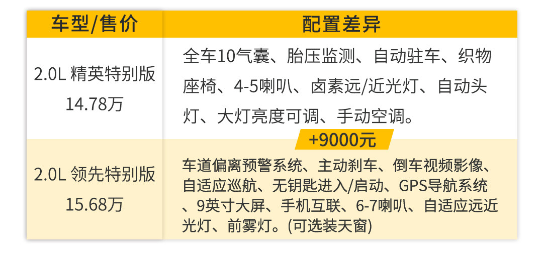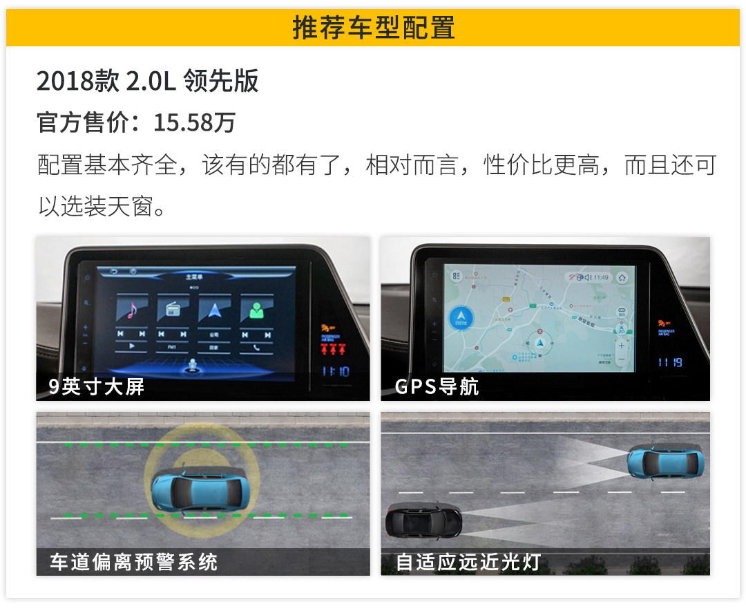 如果是奕泽的话,最低配的配置表其实已经很到位了,但对于C-HR则需要次低配才值得购买,一些这个级别改有的配置都能提供,而且奕泽是全系没有天窗的,但C-HR的基本配置车型(除了特别版),领先版及以上是可以选装天窗的。