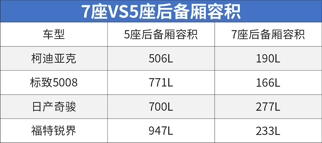理由一:大多数7座SUV的行李厢空间要比5座的小非常多