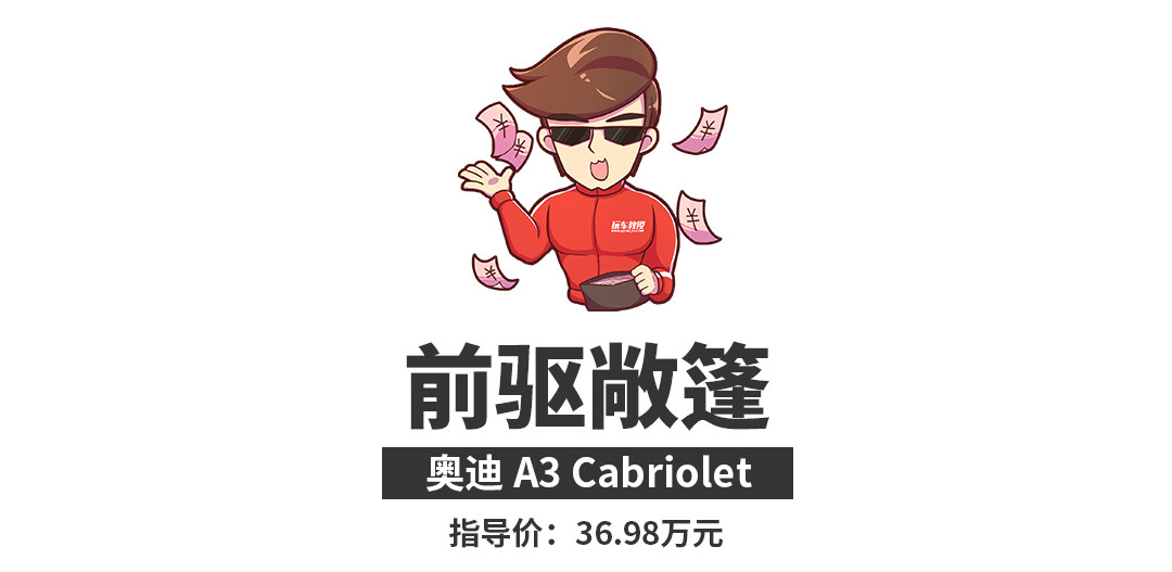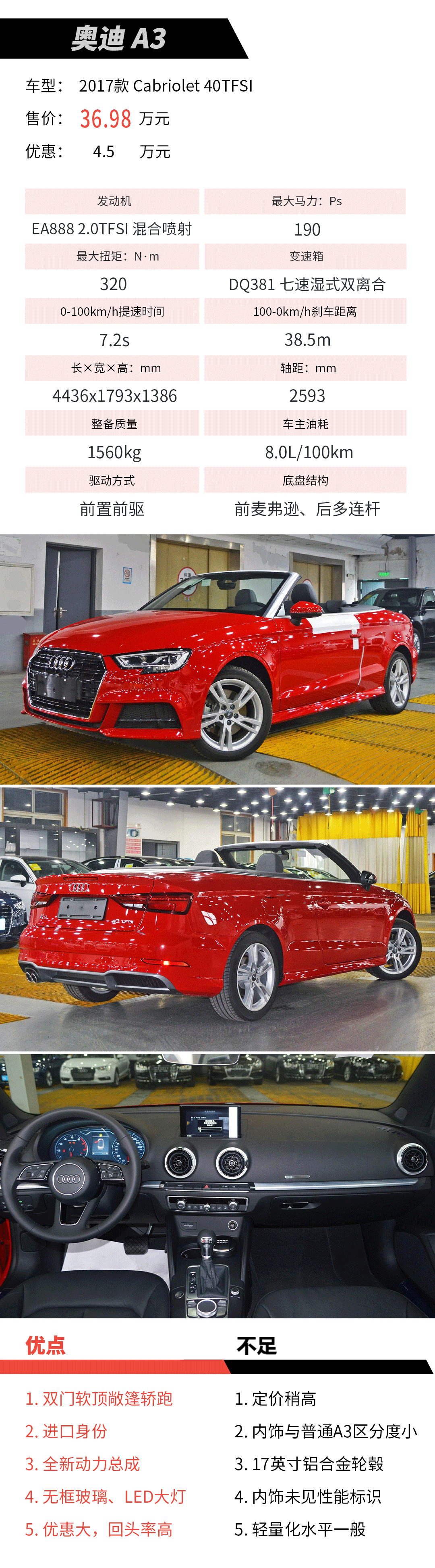 2.0TFSI+DQ381动力组合、国人认账的“四环素”Logo或许是A3 Cabriolet定价虚高的底气,但36.98万元的售价,给我一个不选进口豪华中型车的理由。与此同时,你还得接受小气的17英寸轮毂和平淡内饰。当然,进口身份、双门敞篷、无框玻璃才是其闪光点。软篷敞开,畅享路人注目礼。
