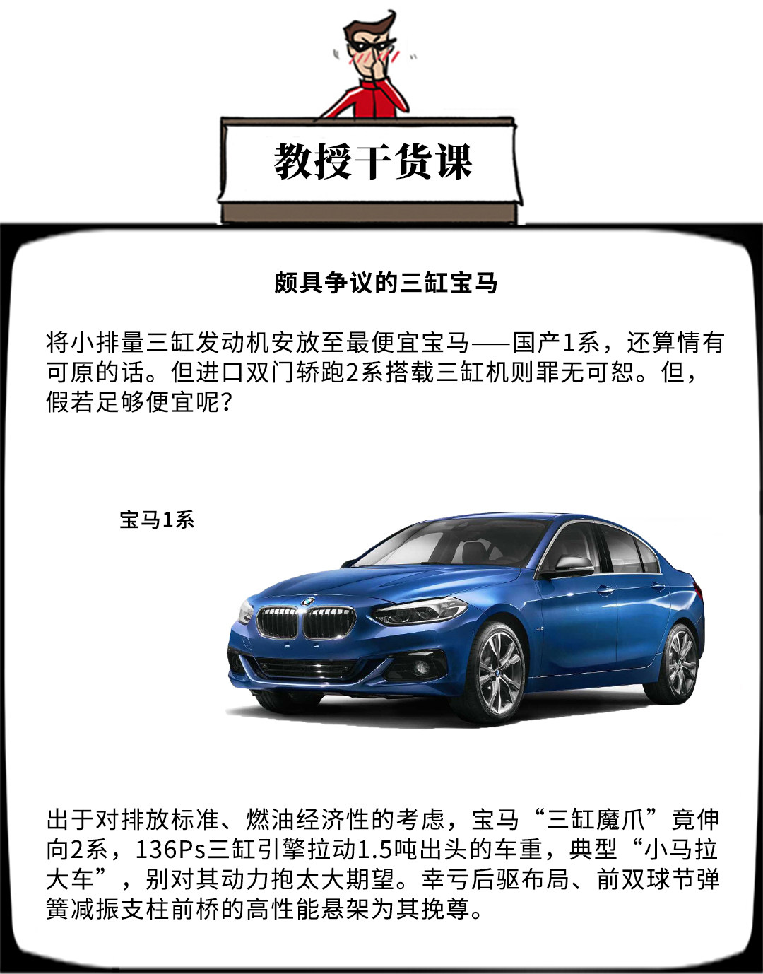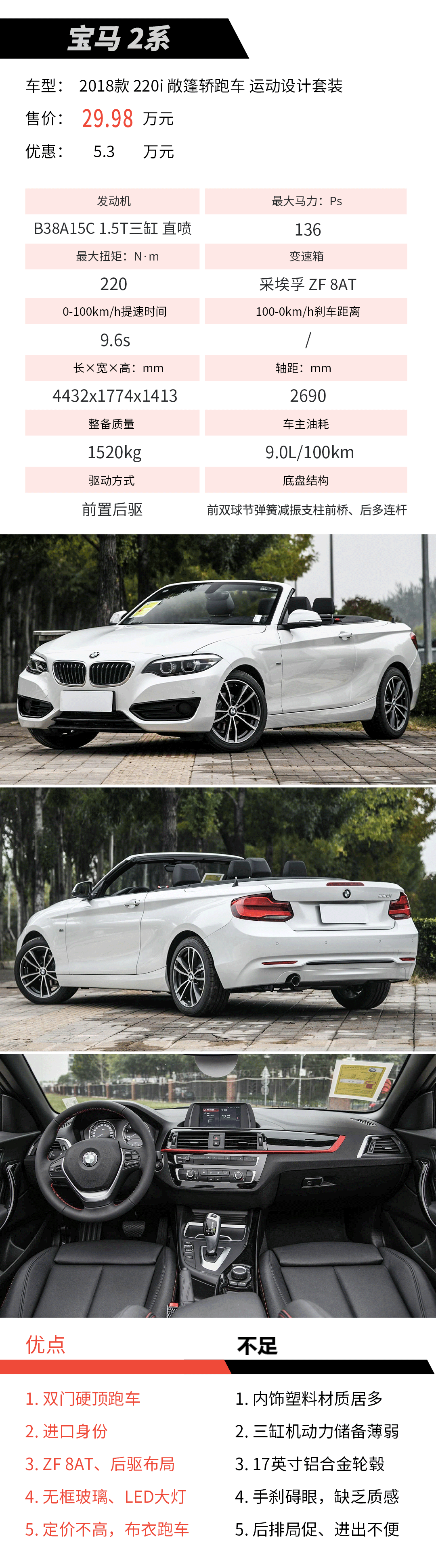 蓝天白云标、进口身份、双门轿跑,能否说服你接受2系沦为“三缸车”的事实?倘若不能,想必是你没看到220i敞篷版25万多的裸车报价单。三十万不到,气场却丝毫不百万豪车,夫复何求?虽说配备后驱+机械手刹,但136Ps马力想漂起来并非易事。