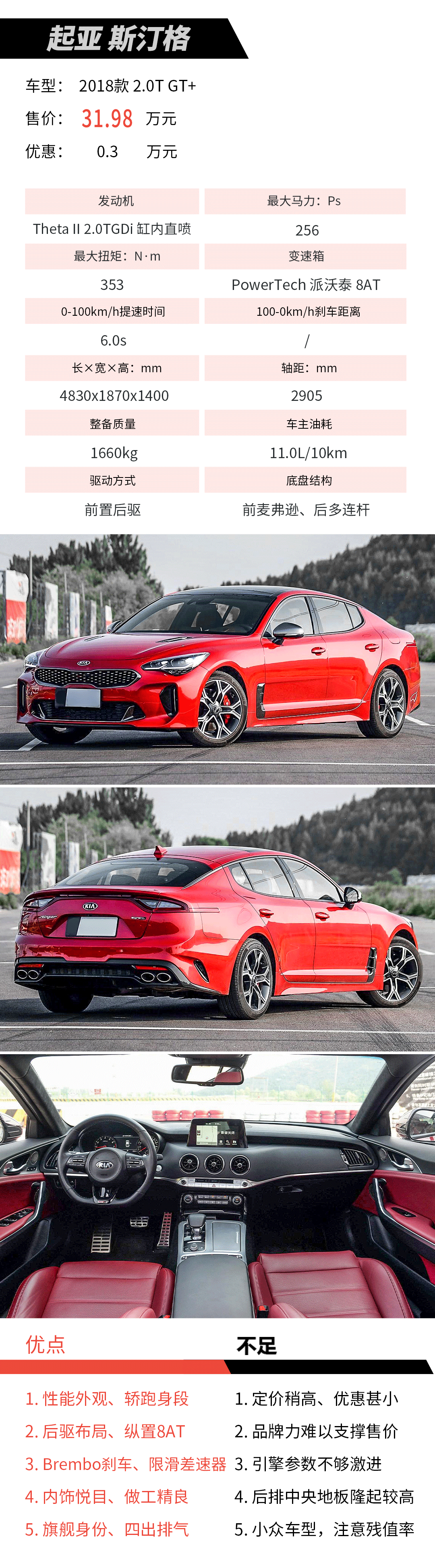 后驱布局、后桥限滑差速器(GT+车型独有)、马牌CSC轮胎赋予斯汀格极高的操控极限,未配备19英寸低扁平比轮胎是一大遗憾。Brembo刹车、四出排气、掀背式尾门、换挡拨片,简直武装到牙齿。远不止此,NAPPA真皮座椅、无线充电、15枚扬声器哈曼卡顿音响让它内外兼修。
