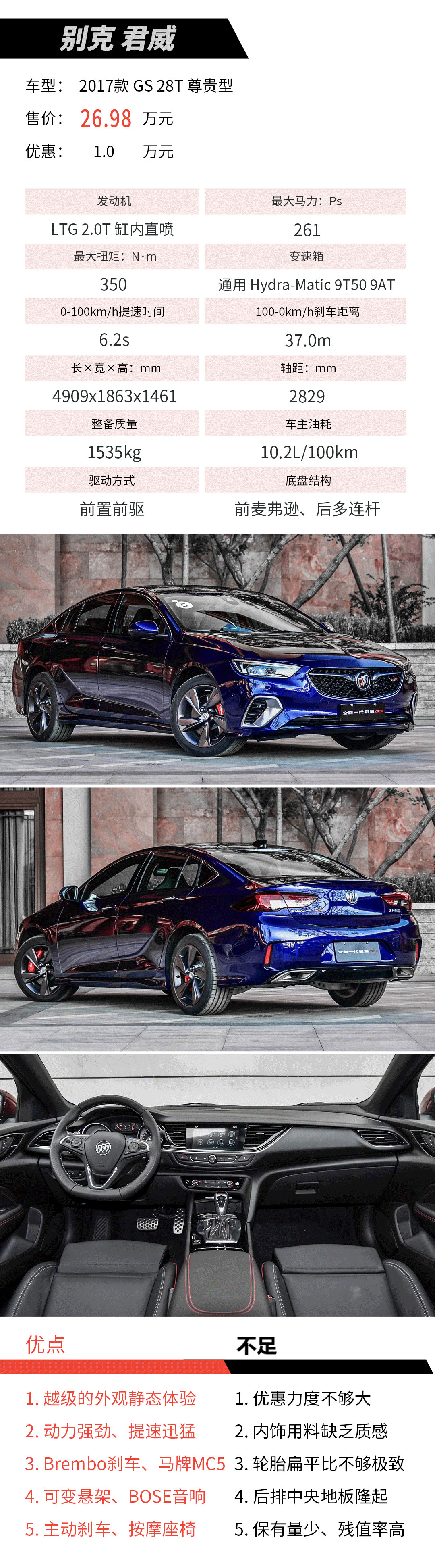 CDC全时主动液力减震系统、FlexRide自适应驾驶系统、换挡拨片、Brembo前四活塞刹车系统、马牌MC5轮胎(245/45 R18)、带Kick down降挡机制的分段式油门,赋予君威GS同级无出其右的动态表现。