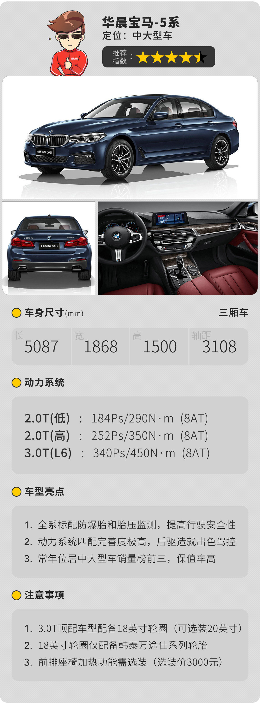 前不久完成换代动作的宝马5系提供豪华和M运动两种套装风格可选,合作无间的动力总成辅以前双叉臂式运动悬架、后驱布局以及倍耐力运动轮胎,让5系依旧稳坐中大型车运动标杆宝座。