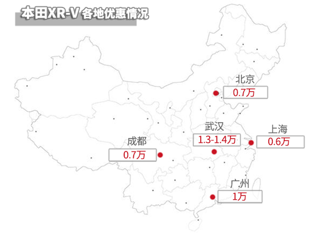 本田XR-V在广州、上海地区大多以现金优惠为主,在北京、成都地区需要在店内上保险。在武汉地区需要加装饰、店内上保险、店内贷款、店内上牌。优惠幅度中规中矩,比较它是一款销量不错的车型,优惠小点也不难理解。