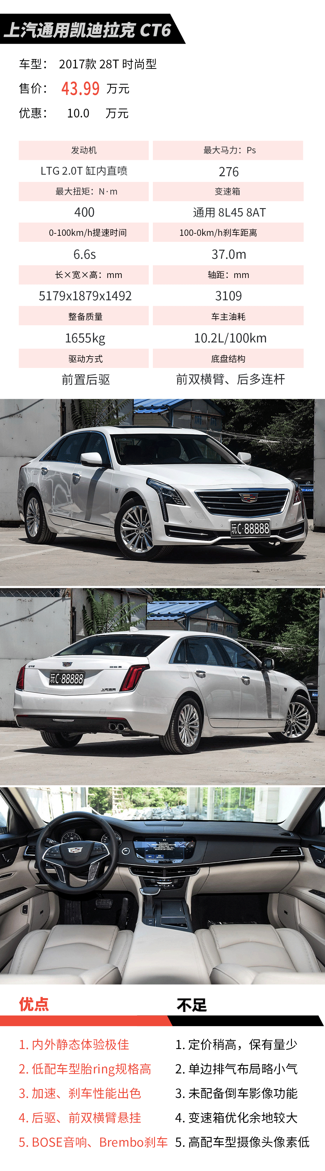 CT6最为人称道的地方除了10万元的巨幅优惠外,还有28T车型一视同仁的动力方案、中低配车型的高规格轮圈和轮胎。远不止此,全系标配意大利Brembo高性能刹车和带主动降噪功能的BOSE音响,辅以近乎完美的内外静态体验,40万内商务车的不二之选。