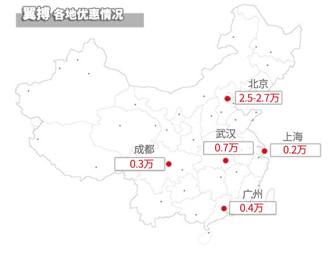 翼搏在广州、上海、成都地区以现金优惠为主,在北京地区需要加装饰、店内上保险、店内贷款、店内上牌、店内置换等项目。在武汉地区需要加装饰和店内贷款。