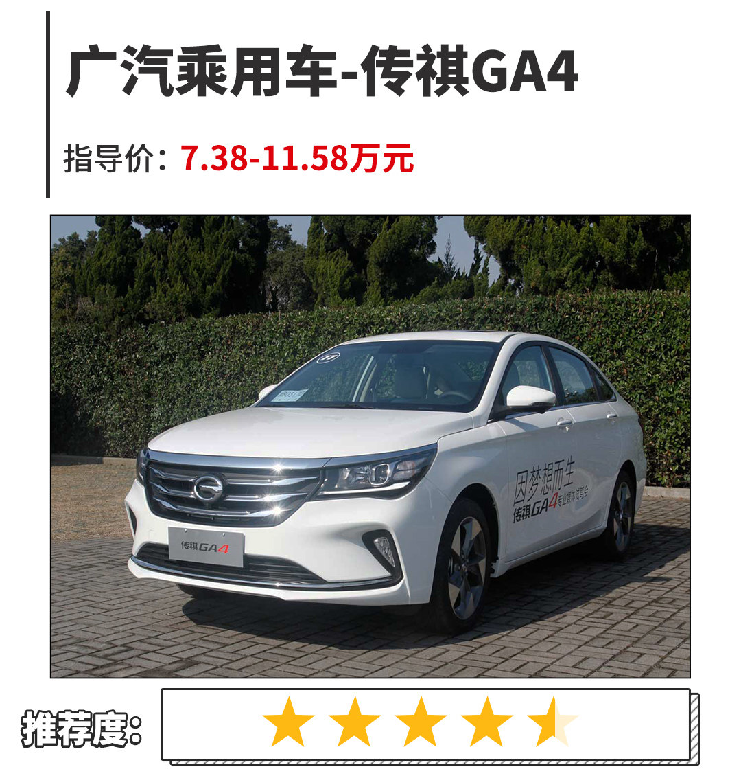 如今国产自主品牌在SUV市场大行其道,相比比之下,轿车市场就不敢恭维了。但是,教授还是找到了一款值得推荐的车型,没错,说的就是传祺GA4。传祺GA4定位为紧凑型轿车,外观大气、耐看,内饰用料、做工品质细节处理较好,入门标配ESP、后驻车雷达、坡道辅助、多功能方向盘、座椅皮革/织物混搭材质和后排空调出风口等装备以及行驶品质给人的好感度颇高。无疑是10万档家用紧凑型轿车中的佼佼者。