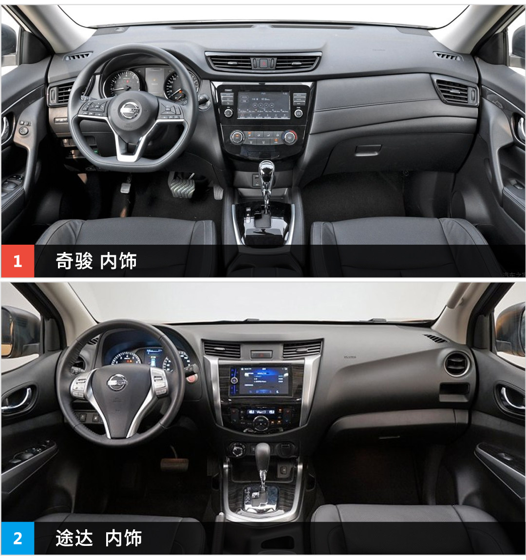 内饰设计方面,中控区的整体布局几乎是一致的,但方面盘的样式明显是奇骏的平底方向盘看上去更高级些,而途达的方向盘样式已经不那么能跟上市场主流了。而且在内饰用料方面,奇骏采用了更多的软性材质和皮革,视觉效果以及触感上都更出色,更符合家用车的需求。