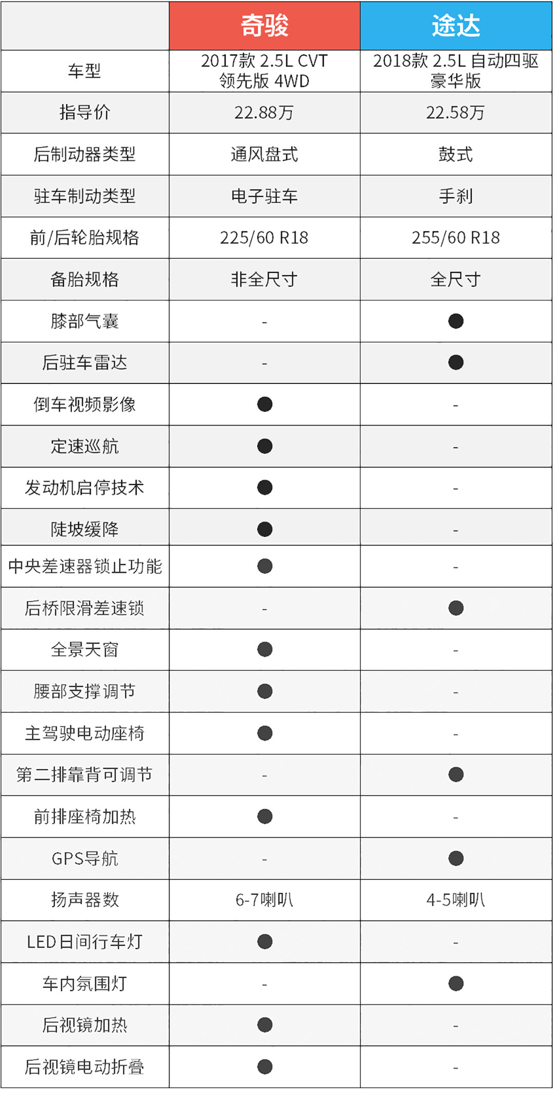 最后我们通过两款指导价比较接近的车型进行其配置差异的对比,从表格中我们可以明显看出奇骏的配置还是要更丰富,更合适作为家庭用车,特别是某些配置的加持也非常重要,比如定速巡航,全景天窗等。而且这里必须补充一点,就是目前奇骏在各大的确都有2-3万这样的优惠幅度,而途达由于上市时间不长,暂无优惠,所以综合而已,其实奇骏的性价比还是更好。