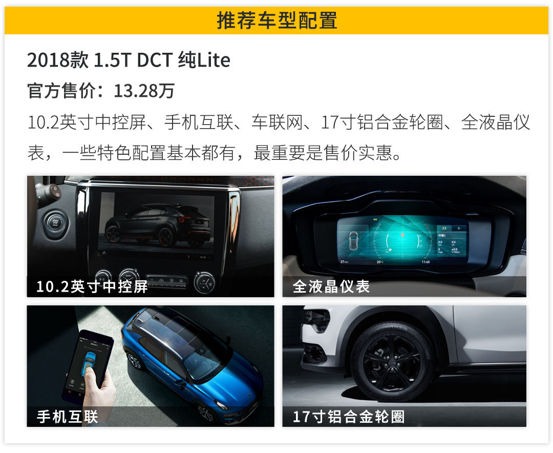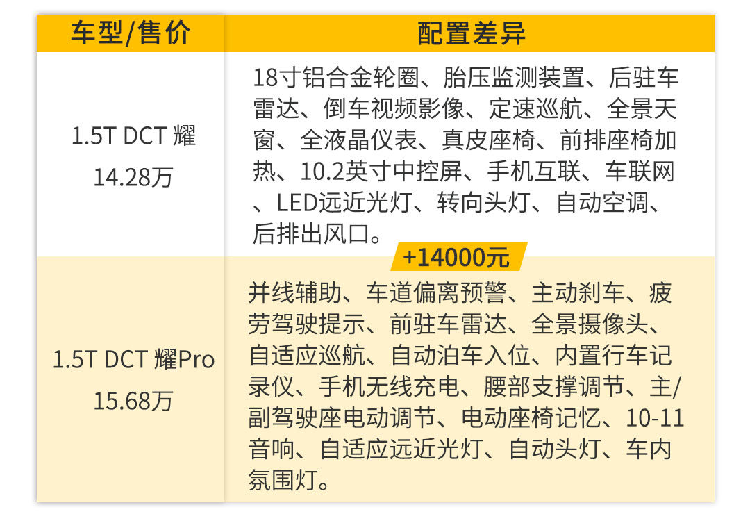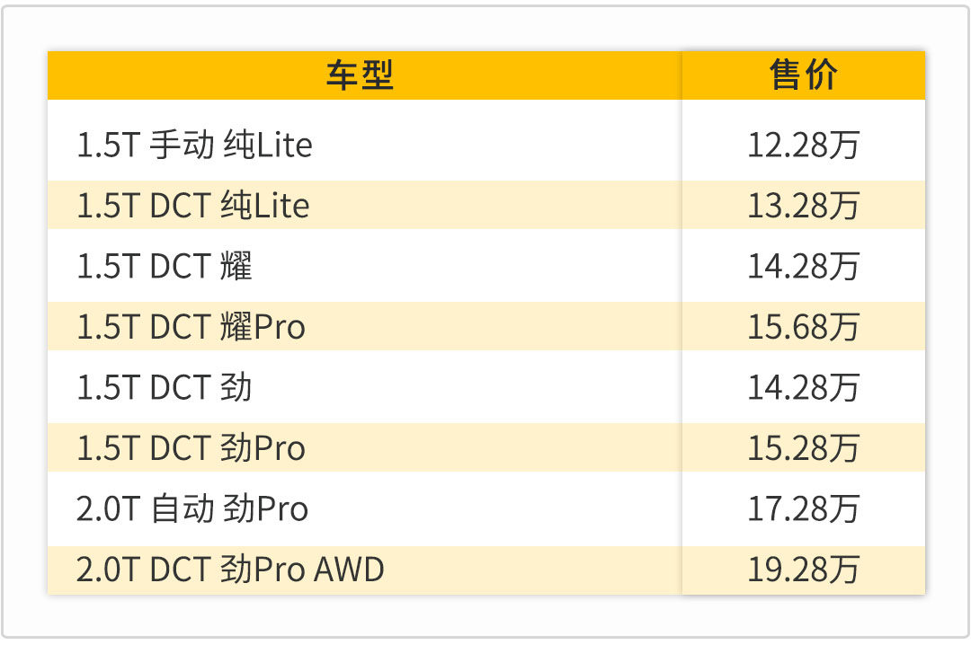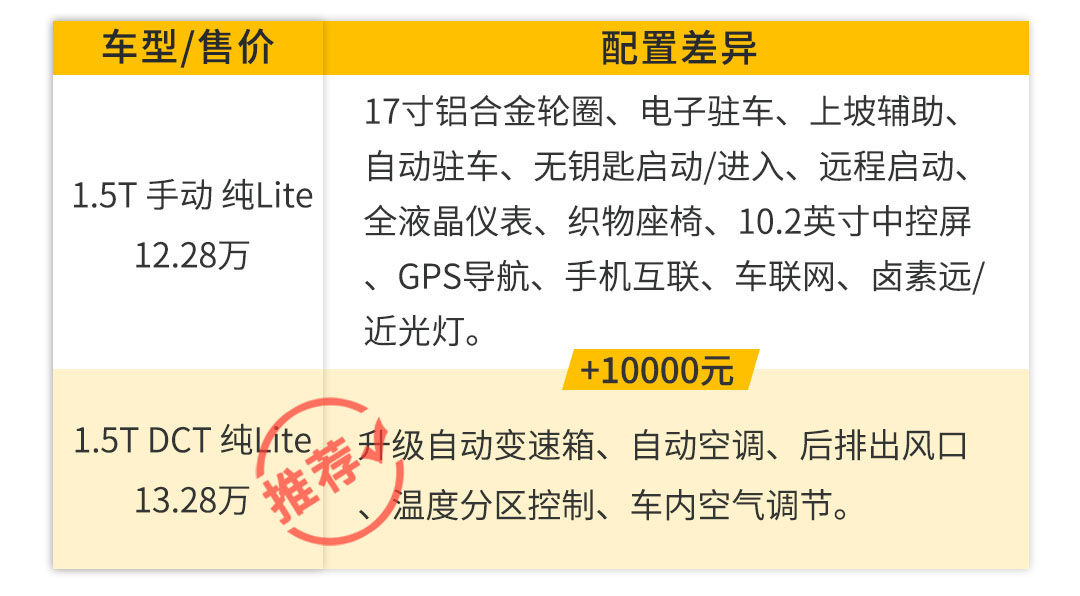在到配置方面,首先我们分开3个外观设计来对比,配置表就很清晰了。纯系列有两款车型,分别是手动挡和自动挡,搭载的都是1.5T低功率发动机,售价方面比较有吸引力,对于那些喜欢其外观设计以及内饰各种大屏,但对动力没有要求的女司机还是非常推荐1.5T DCT 纯Lite的,唯一遗憾就是没有配备全景天窗。