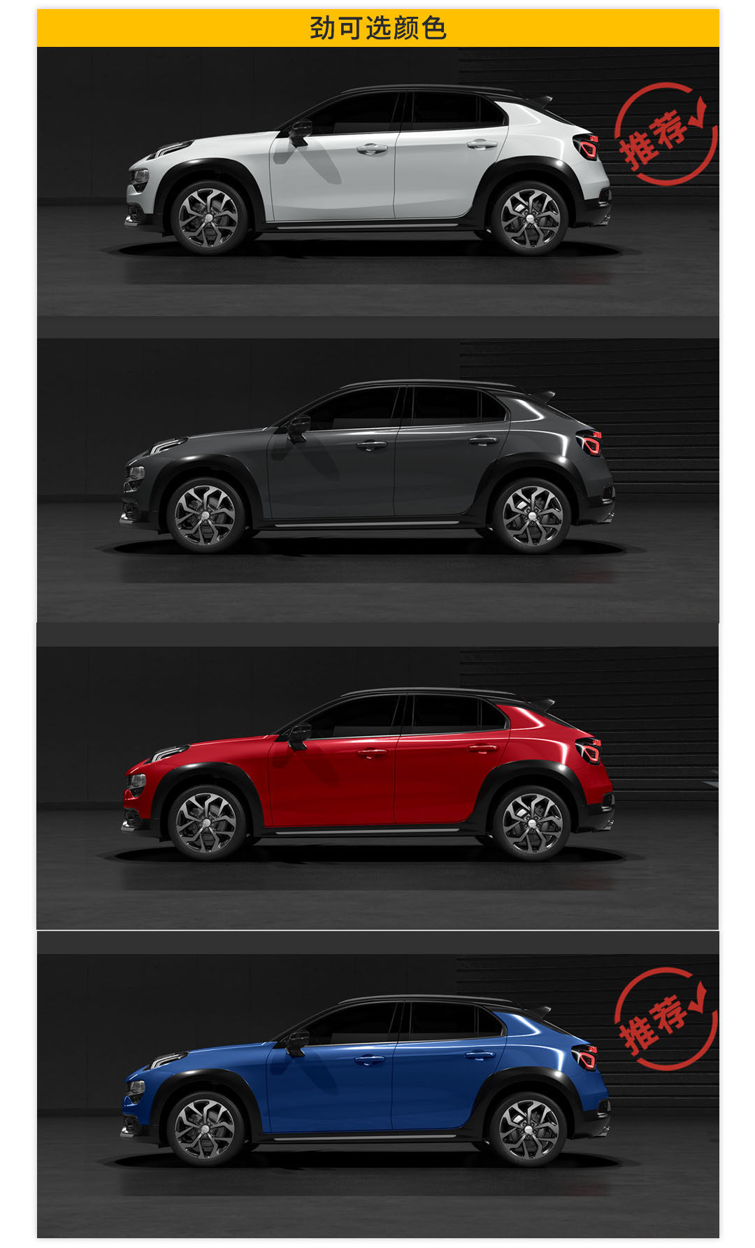 领克02在可选颜色方面的确有点让人无奈的,本来颜色就不多,而且不同配置车型的可选颜色也不一样。目前,纯系列和耀系列各自都仅有一种颜色可选,而劲系列则有4中颜色可选,最推荐的是劲的白色和蓝色。