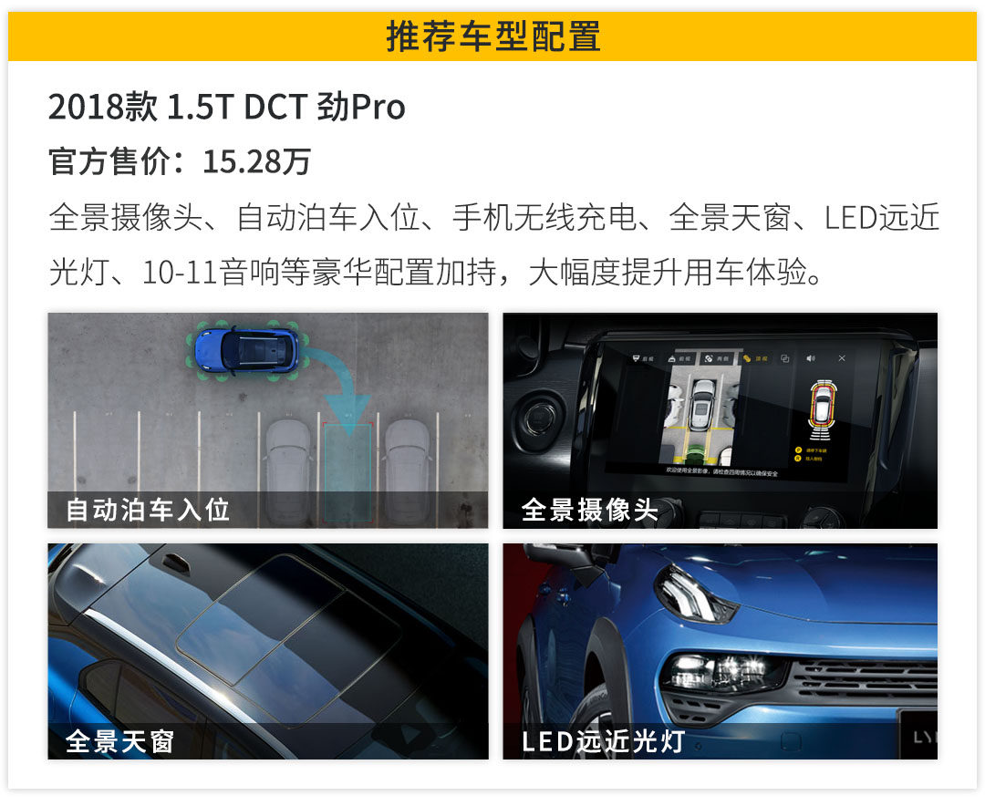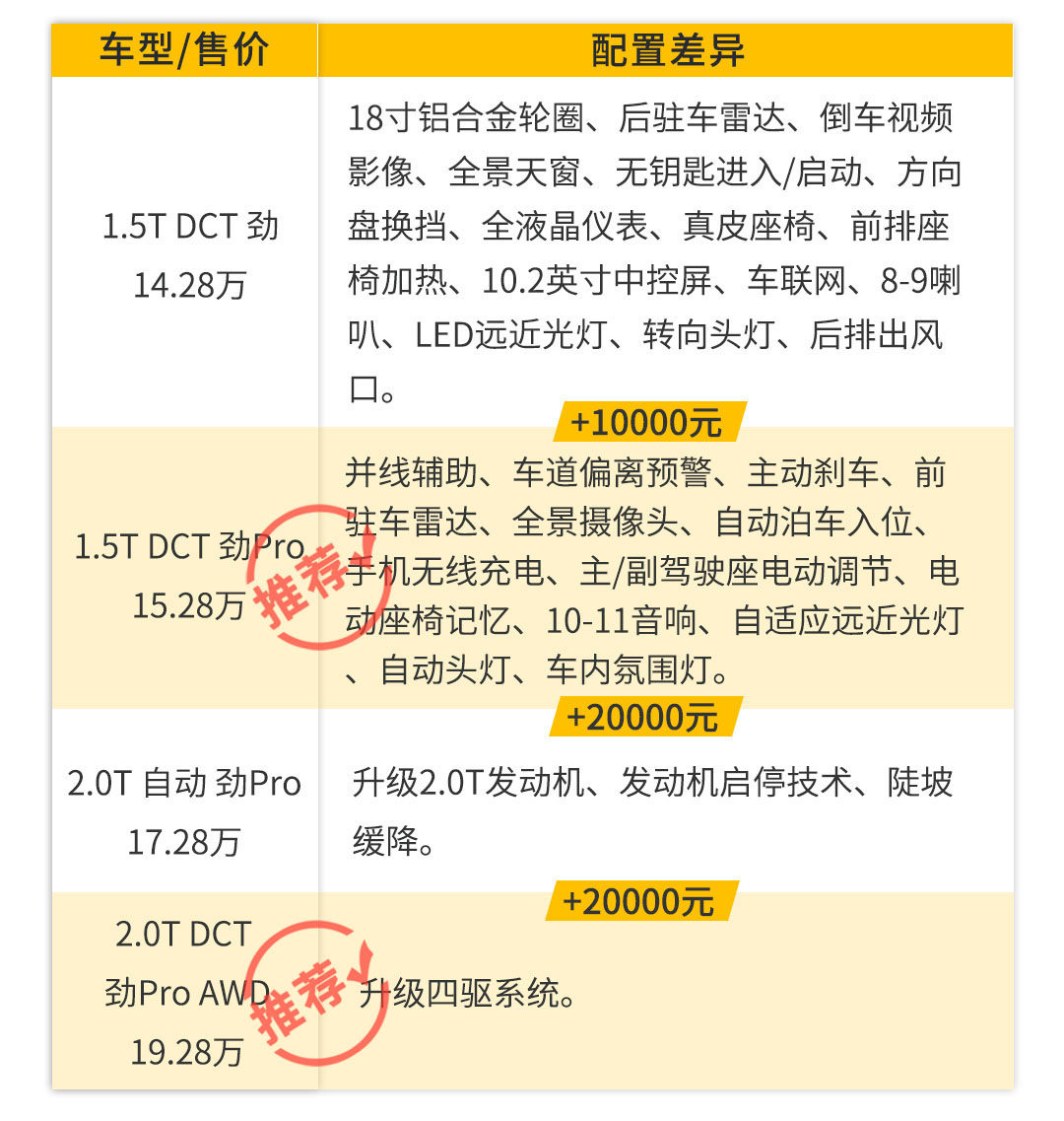 第二款推荐的车型是1.5T DCT 劲Pro,其实1.5T DCT 劲的配置已经非常丰富了,应该的都有,不过由于它与1.5T DCT 劲Pro的差价只有1万,加多1万可以买到的配置价值甚至超过2万,无论是一些安全配备上还是一些豪华配置都能给你带来跟高一个层次的用车体验。