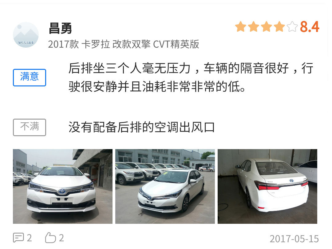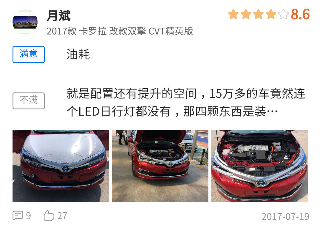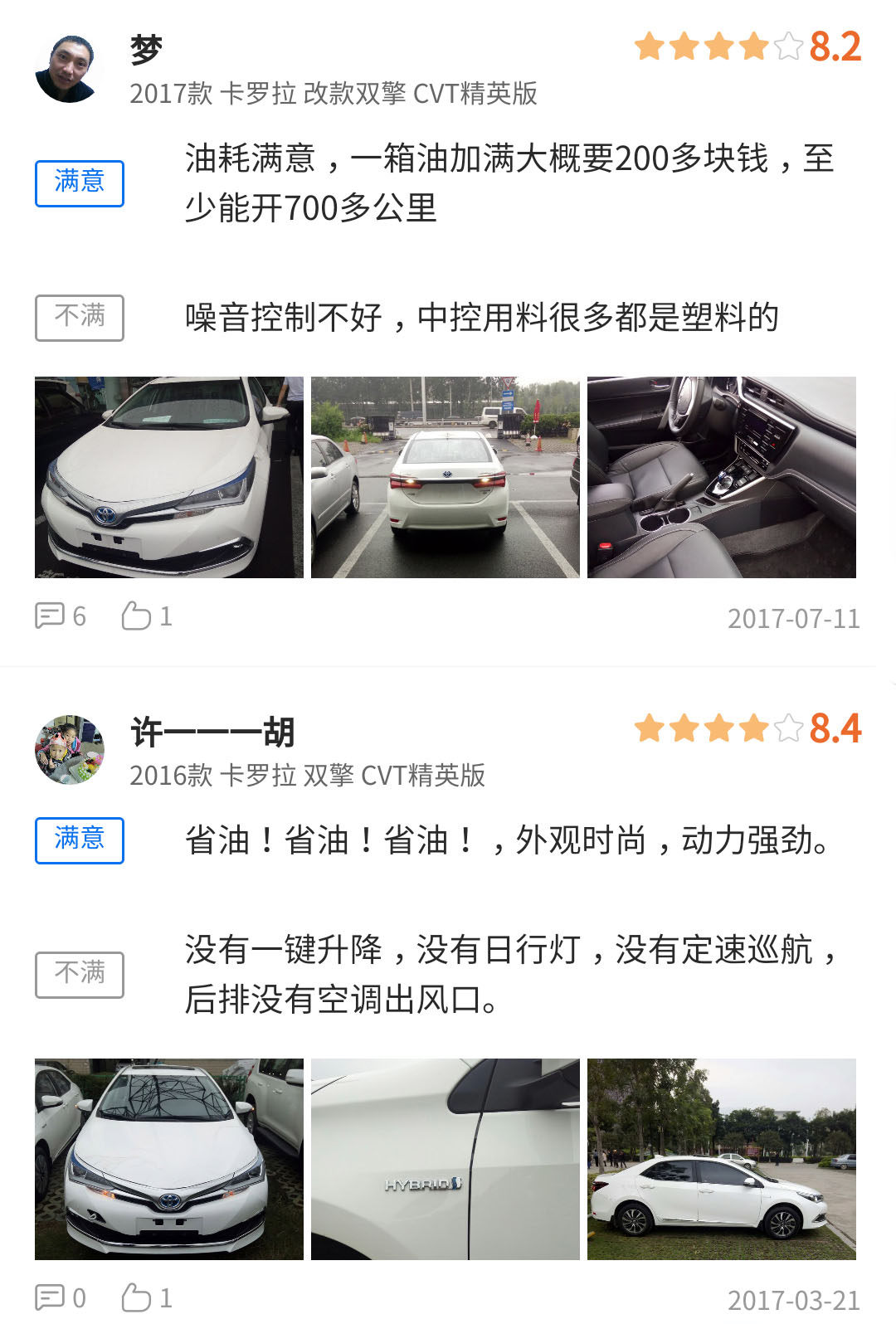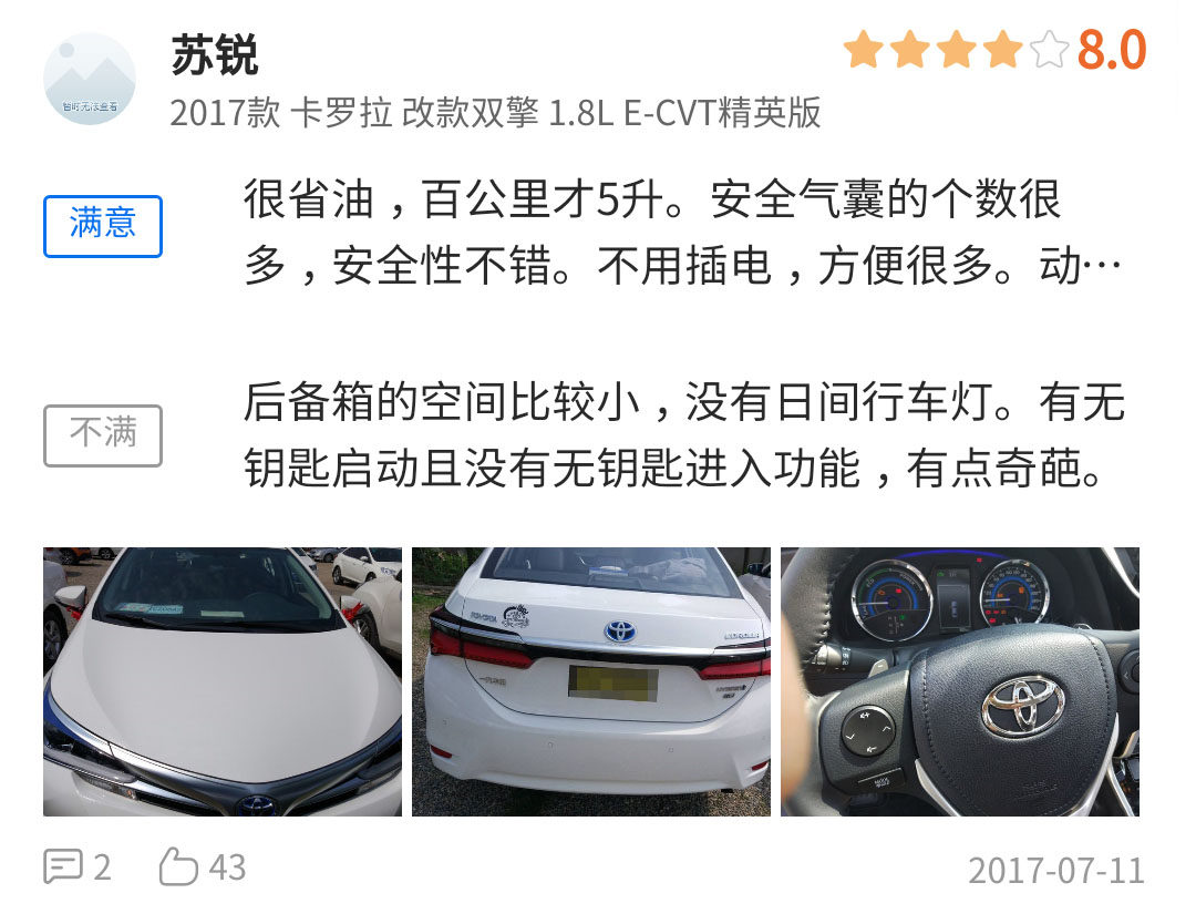 从车主口碑中总结到车主们对这款车最满意的地方就是油耗表现,通过大量的油耗调查,其车主们所报的综合油耗在4.3-4.8L/100km之间,与官方的油耗数据没多大出入,的确值得点赞。其次也有不少车主认为卡罗拉双擎的外观设计很不错。而最不满意的基本都是在配置反面,都认为这个价位的配置应该更高一些。