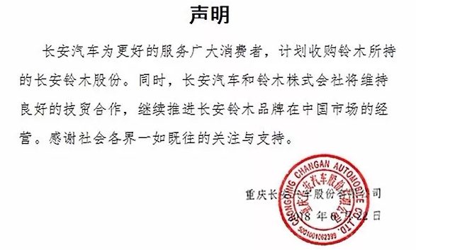 铃木退出,长安汽车将收购铃木所持长安铃木股份