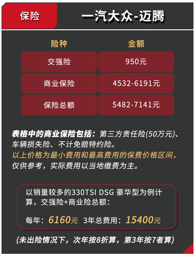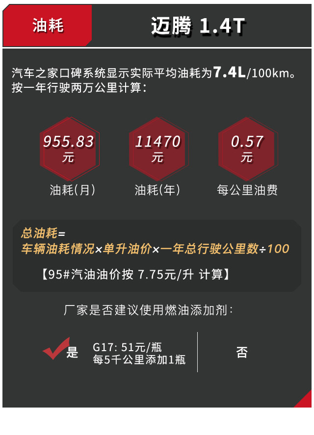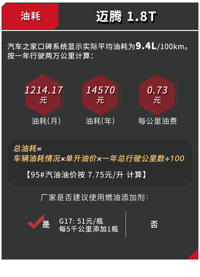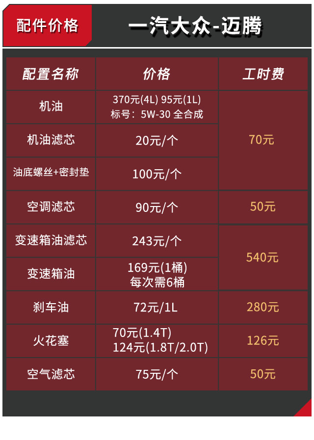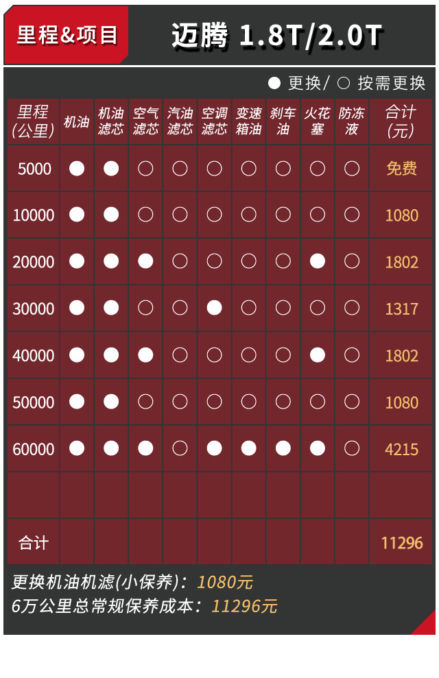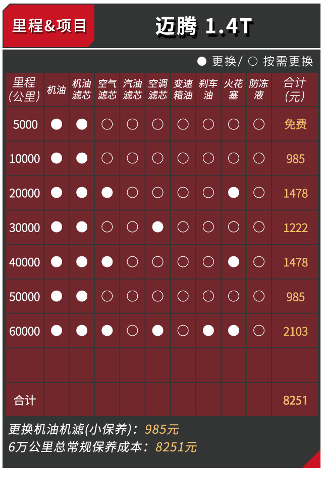 厂家建议的保养间隔为10000公里/次,首保为5000公里,为免费赠送;汽油滤芯为免维护设计,正常使用下无需更换;而像2.0T车型的每年总花费还是比较高的,特别是在保养上的花费已与部分豪华品牌接近;虽然迈腾整体优惠幅度不错,但在后期养护成本上还是需要结合实际多加考虑。