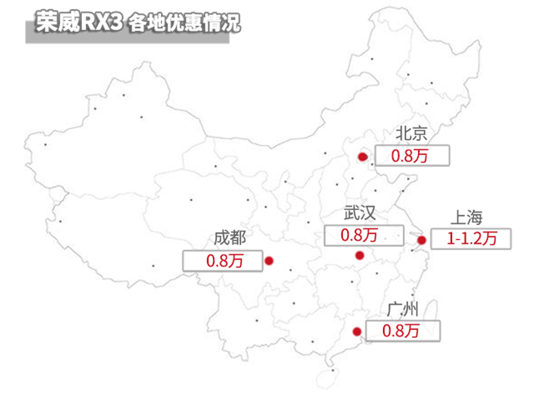 荣威RX3在上图的几大地区都以现金优惠为主,而且优惠幅度也比较统一,还是比较实惠的!