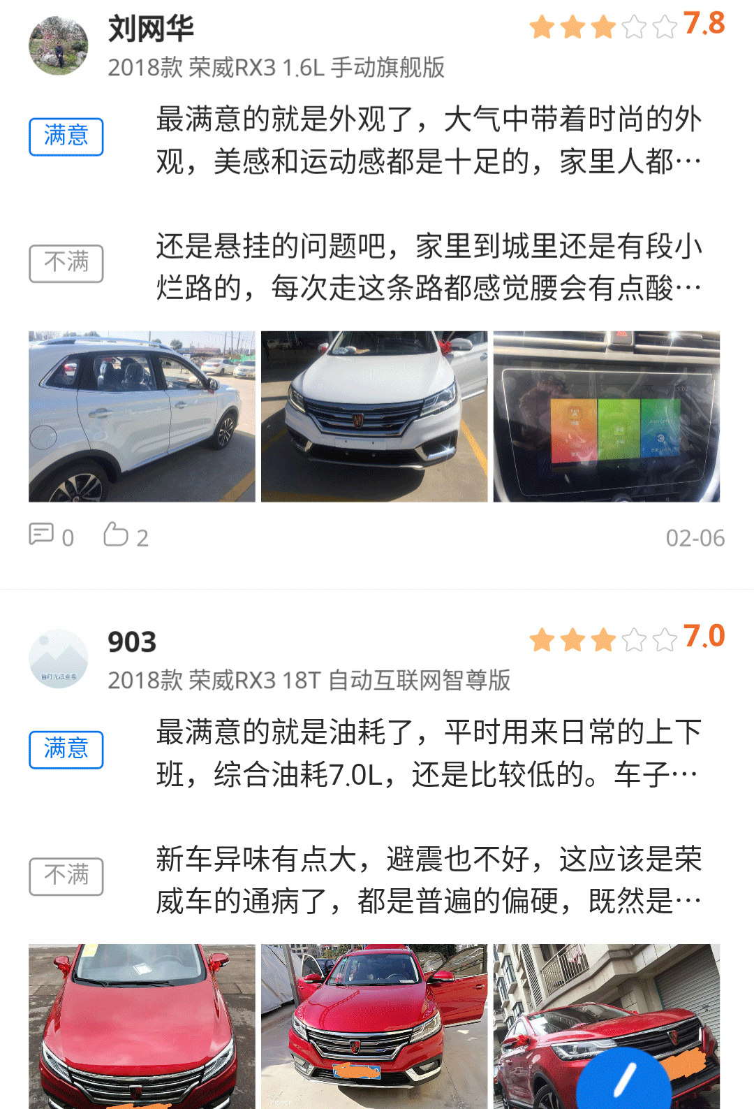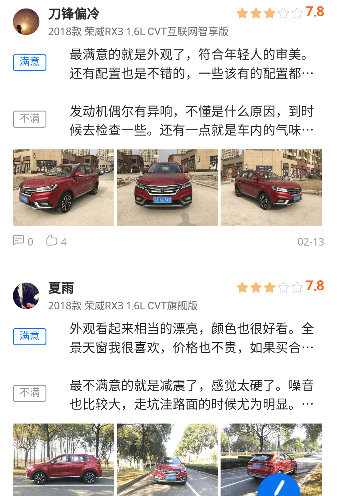 喜欢看更多车主对于这款车型评价的朋友现在马上点开小程序查看哦!这里我们可以看出车主们对它的时尚设计、全景天窗、各项配置等比较满意,而且表示油耗也比较低!同时对悬架的软硬有一些吐槽。
