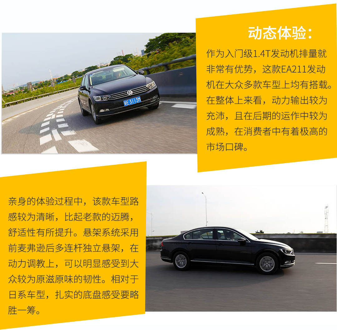 得益于MQB平台化生产,迈腾的整车选择性跨度大,1.4T、1.8T、2.0T三种不同动力组合,能够给予消费者更多的选择。除了发动机排量不一样之外,平台作业下的车型在重要零部件上都几乎一模一样。