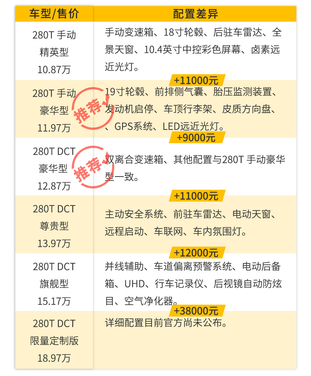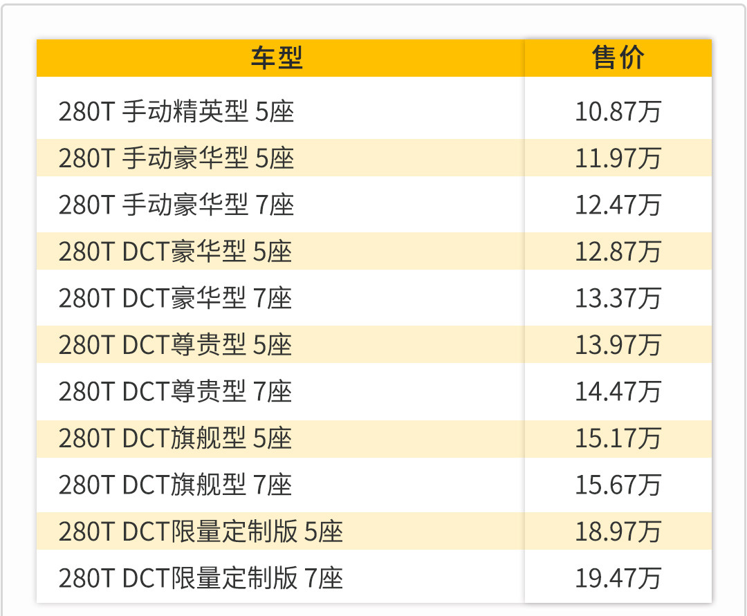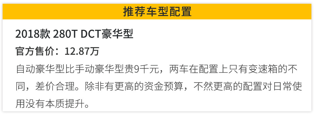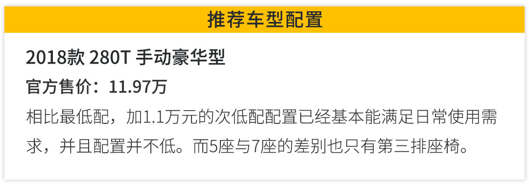 这里注意一下的是,除了精英型外,其余车型都可以选装第三排座椅,选装费是5千元。7座版本的第三排坐着有种小板凳的感觉,而且椅靠背还不能按比例放倒,扩展灵活性上表现不足,只适合临时的应急,如果阁下有这种应急需求,多花5千元选择7座版本也是可以,但如果很少坐5个以上的人,那选择5座版本会更合适和更省钱。