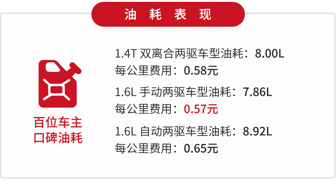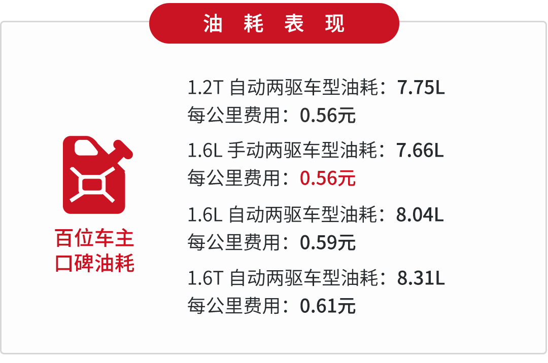 与1.2T发动机匹配的是5MT和6AT变速箱,手动挡车型的传动效率还算高效。自动挡车型采用的是6AT变速箱,虽有液力变矩器加持,但是整体优化出色,所以油耗并不太高。1.6T车型的表现令人颇为惊喜,直喷发动机对于省油的帮助颇大。