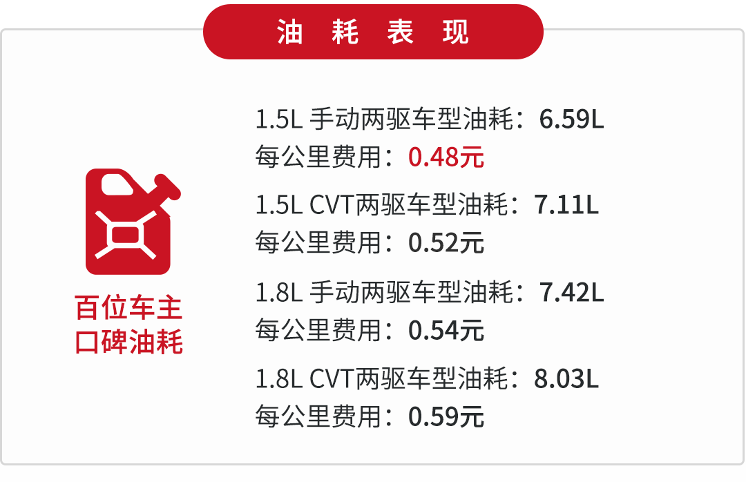 手动挡车型用的是6MT变速箱,多一个挡位可以有效降低高速时的巡航转速,从而提升燃油经济性。1390kg的整备质量不算太重,这也为低油耗做出了一点贡献。自动挡车型虽然采用的是6AT变速箱,有液力变矩器在损耗,但是1420kg的整备质量加上良好的发动机与变速箱匹配,使得油耗表现在一个可接受的范围内。