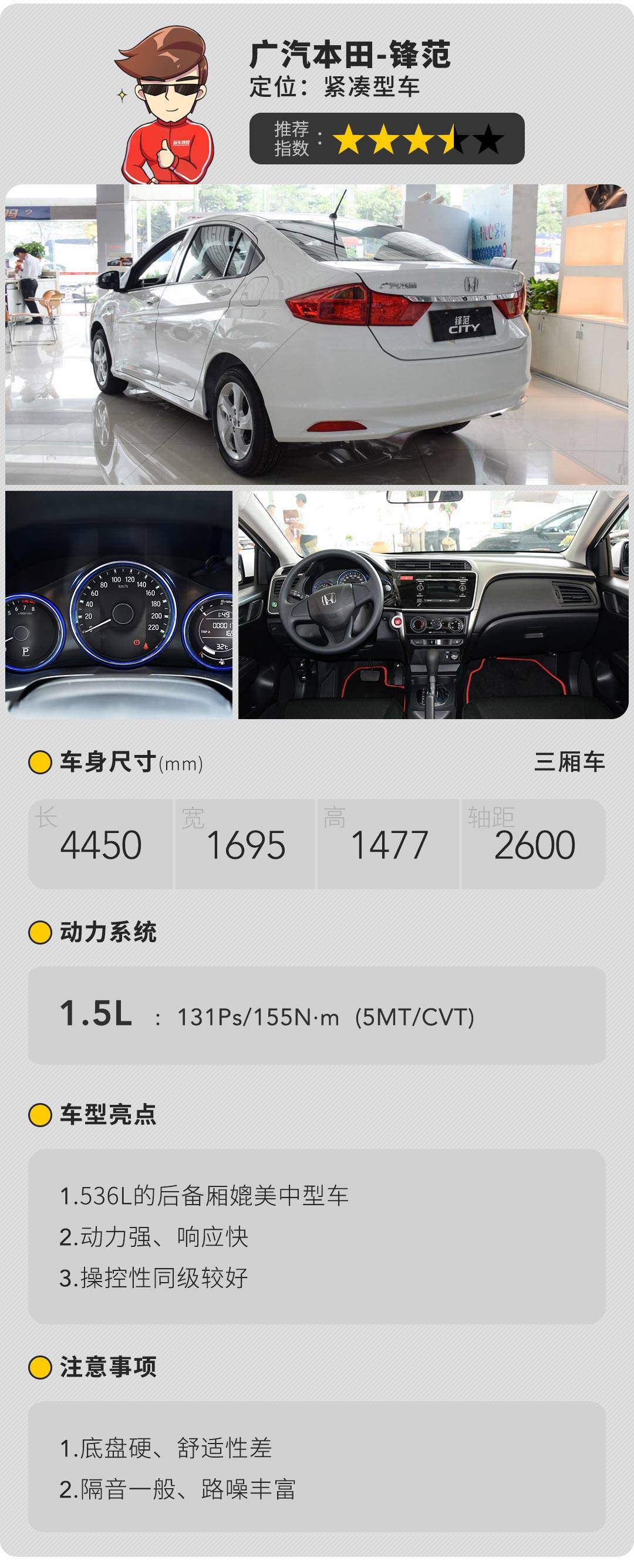 车型优势:本田锋范是一款非常值得推荐的紧凑型轿车,它的价格仅仅比飞度要贵一点点,尺寸和空间却要比飞度大不少。在动力上,锋范搭载1.5L地球梦的发动机,虽然不如在飞度上表现抢眼,但是在同级中,锋范的动力算得上强,并且响应快,能带给车主很好的驾驶乐趣。