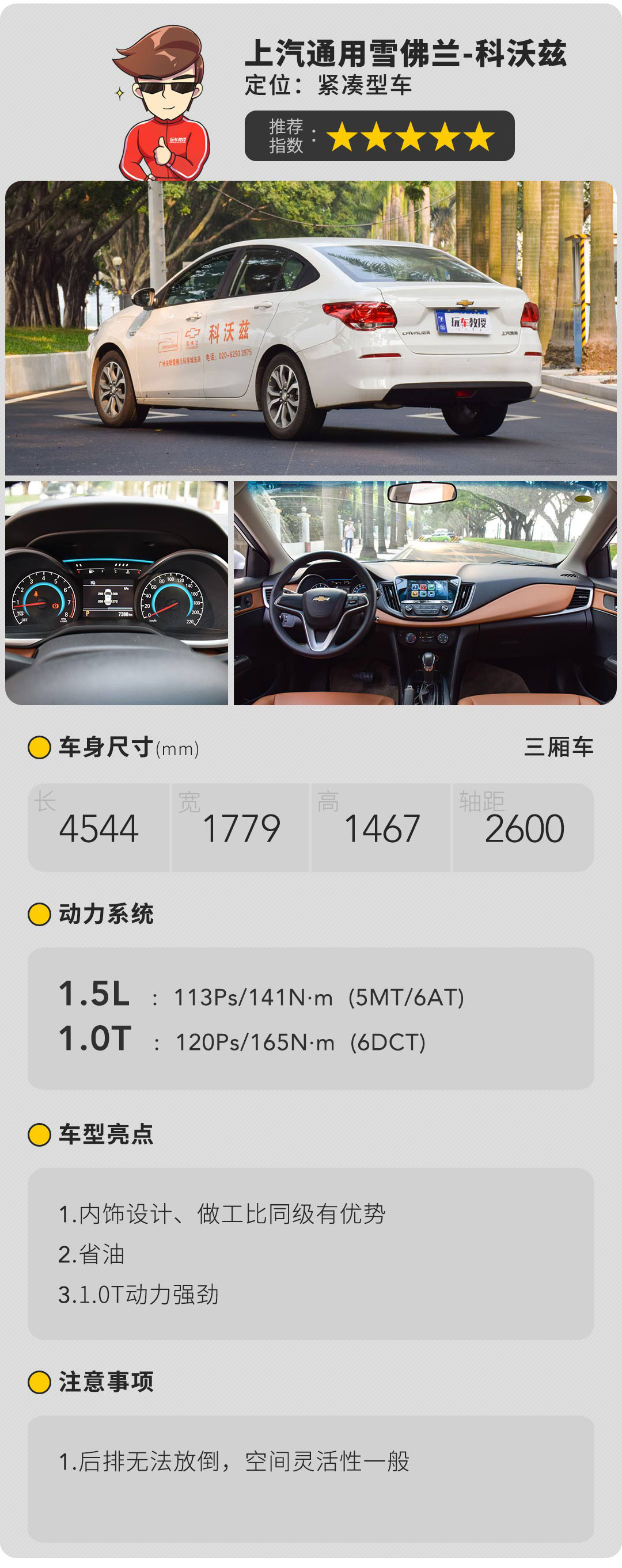 车型优势:科沃兹的尺寸比一众对手长一些,所以外观线条更舒展,气场更足。内饰设计工整,用料朴实。科沃兹的配置也不差,全系标配自动启停,顶配标配倒车影像,中配也可以选装,娱乐性配置也是可圈可点。另外科沃兹全车储物总容量高达430L,20处人性化储物空间,取放轻松随意。还有独特的方形杯托,在保证一般圆形瓶子收纳能力的前提下,还能容纳更大的方形物体,可放置烟灰缸、盒装牛奶、大杯星巴克咖啡等。