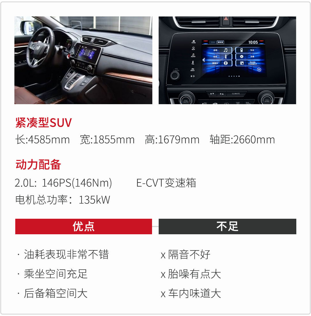 CR-V混动和燃油版的外观没有太大差异,出了一些标识不同个,设计细节不细心也看不出来。但内饰的差异就比较大,主要是燃油版采用的是传动的挡杆设计,而混动版采用的是电子按键式换挡设计,很多车主标识这样的设计体验非常不错。目前来说,CR-V的混动车型暂时没有什么优惠政策,就价格而言不算吸引,但1.5T机油门事件后,再加上混动车型优异的油耗表现,其实CR-V的混动还是一个非常不错的选择。