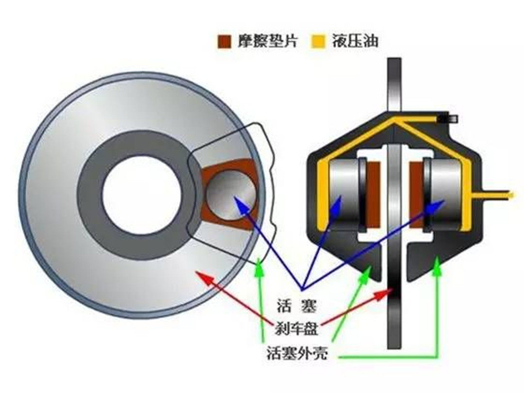 原理:碟式刹车是指采用金属碟(盘)而不用鼓轮的刹车系统。碟式刹车的刹车碟随车轮转动,在刹车碟的两边都各有一块刹车片,在刹车时,通过液压控制,刹车卡钳活塞会推动刹车片夹住刹车碟产生摩擦力,达到制动效果。