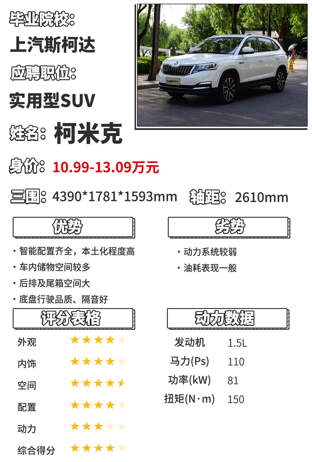 不久之前,上汽斯柯达柯氏家族中的小弟柯米克正式上市,10.99-13.09万元的售价,在价格竞争力上不容小视。新车的外观依旧走的是斯柯达家族风格,运用水晶切割设计,外观好坏见仁见智。车厢内部绝对是柯米克令人惊喜的地方,全系标配8英寸多媒体显示屏,而且内置软件本土化程度较高,使用十分便捷。此外,车厢后排以及行李箱空间也为柯米克加分不少。而柯米克的动力配置却是它的软肋,动力参数是四辆车里最弱的,经过实测也得出对应的结论,再之油耗表现着实一般,不过其出色的底盘以及噪音控制表现为柯米克整体的机械表现扳回一城。