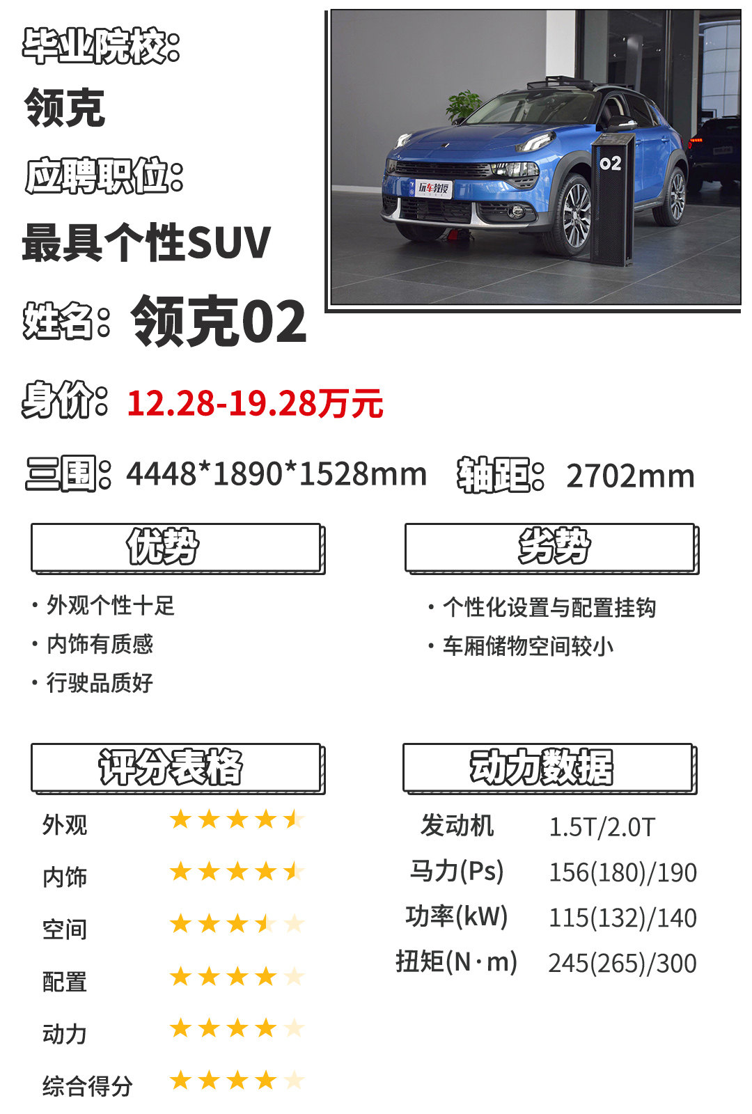 领克的产品一直是极具年轻个性的,对比领克01,领克02的定位更加年轻。溜背式的造型配合紧凑的车身,整车散发着浓烈的跨界气味。领克02不仅有着一副好皮囊,而且它的内饰绝不含糊,内饰设计布局与领克01大致相同,用料以及质感给人好感度极高。领克02提供了1.5T和2.0T两款发动机,其中1.5T发动机分高/低功率,传动方面匹配6MT/7DCT变速箱。而2.0T发动机则匹配6AT/7DCT变速箱,四驱车型只出现2.0T动力配置的车款上,1.5T车型都为前驱,选择时需要注意了。