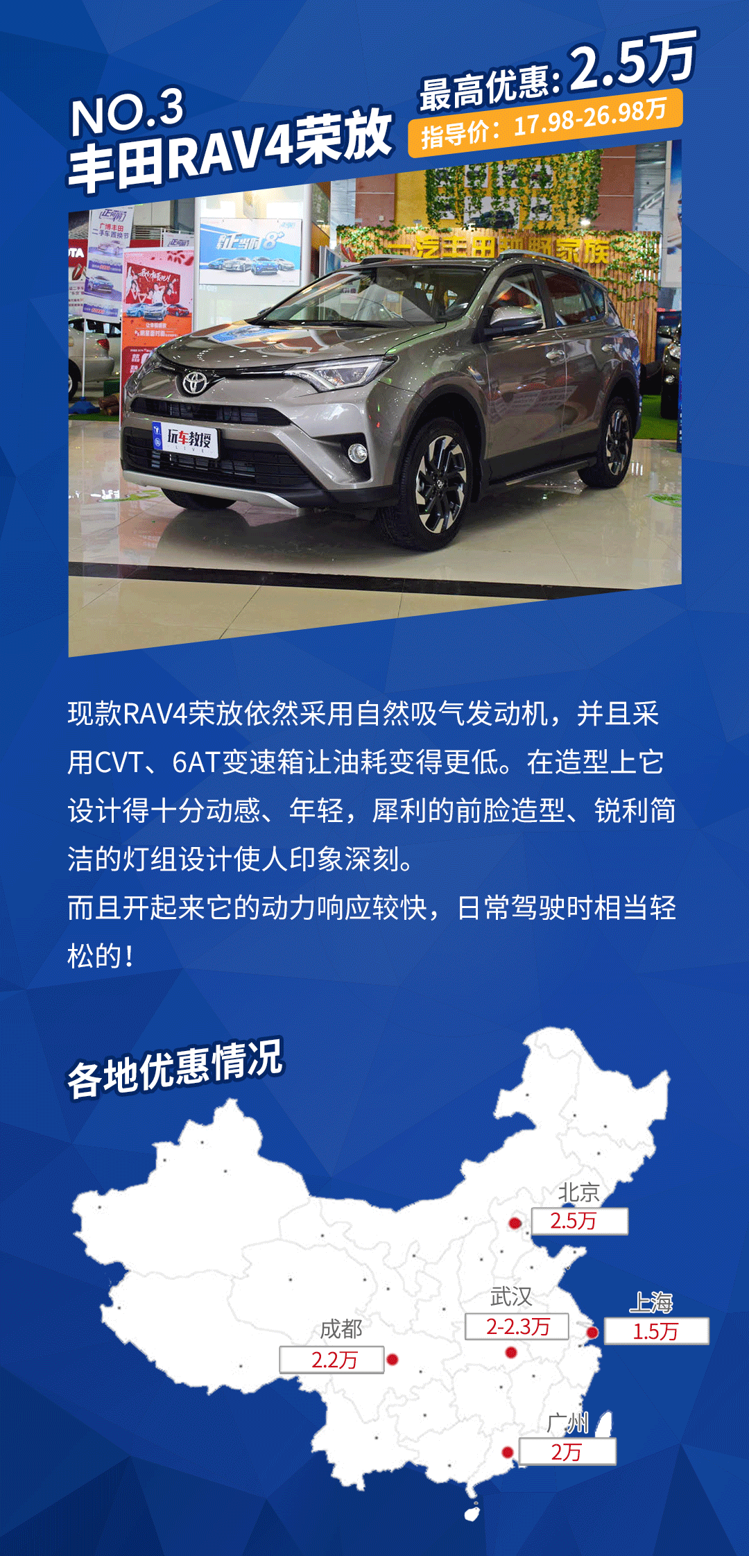 RAV4荣放优惠详情:在广州、北京地区需要搭配店内上保险和店内上牌。在武汉地区需要搭配加装饰、店内贷款、店内上牌等项目!它在华东、华南地区优惠不算太大,这大概是因为它的品牌过硬,所以不太依赖降价。