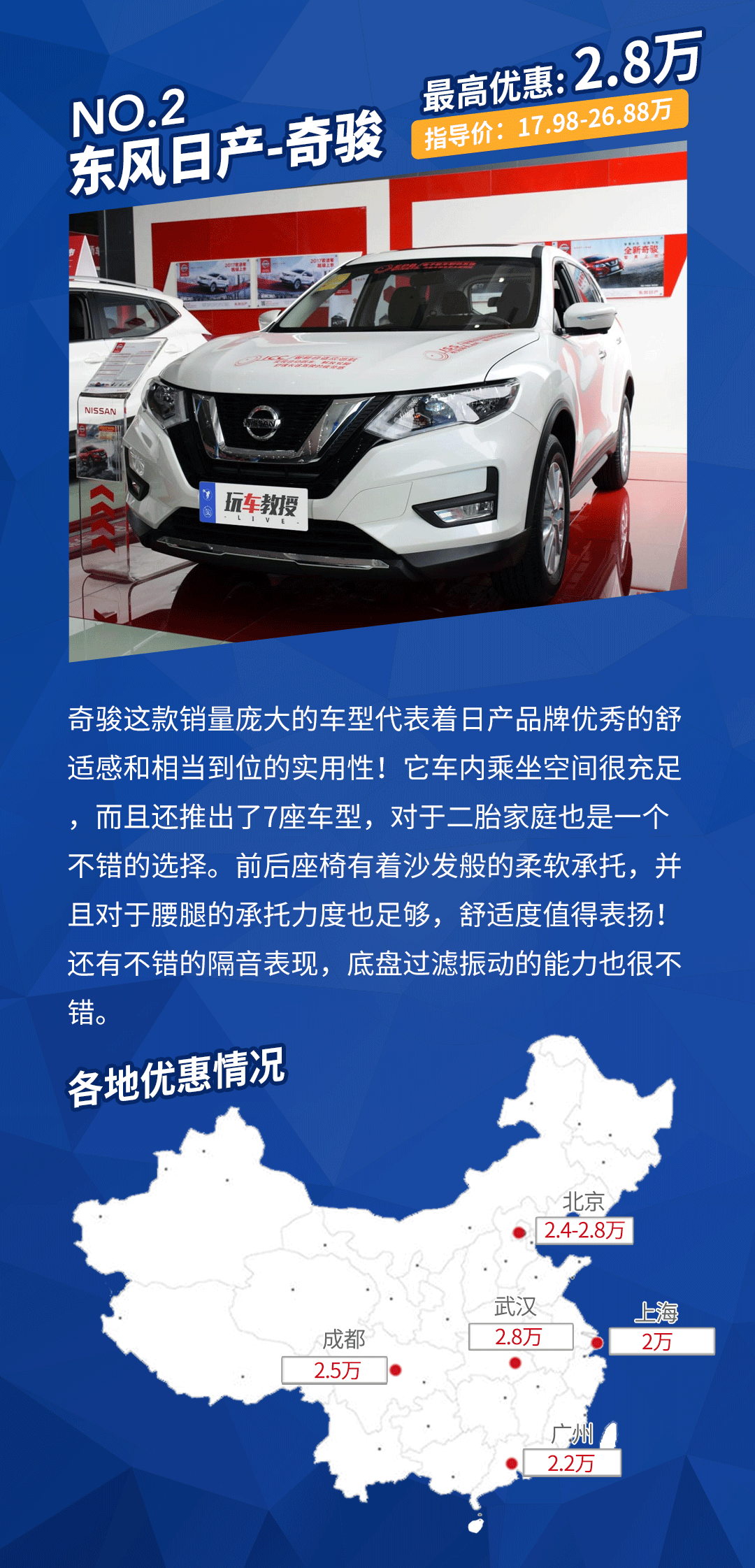 奇骏优惠详情:在广州地区需要搭配店内上保险、店内上牌、店内置换等项目。在北京地区只需要在店内上保险。武汉、成都和上海地区则为现金优惠。优惠幅度还是相当不错的,奇骏的性价比不错,这也是它能持续热销的原因之一。
