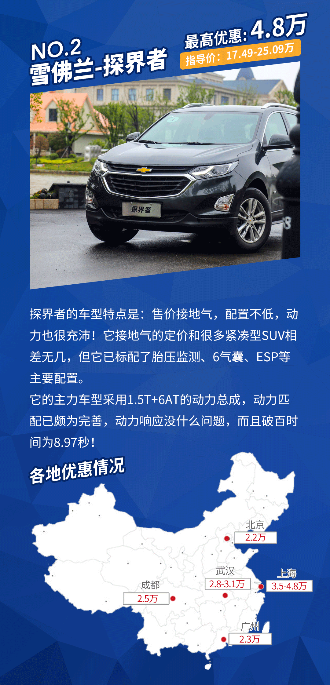 探界者优惠详情:在广州、成都地区为现金优惠,在北京需要在店内上保险。在武汉、上海地区则需要加装饰、店内上保险、店内贷款、店内上牌、需购买精品等搭配项目。探界者的综合优惠幅度挺大的,而且本身的车价也不算高!
