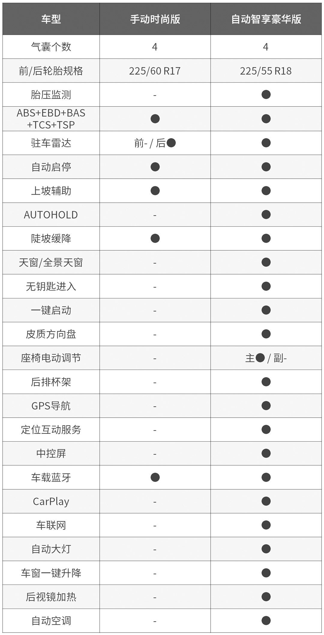 因为,这两个车型,不是配置水平的区别,而是【什么都没有】和【什么都有】的两个区别,两个配置差价两万,即便是自动变速箱值1万,剩下的配置……..请看表吧: