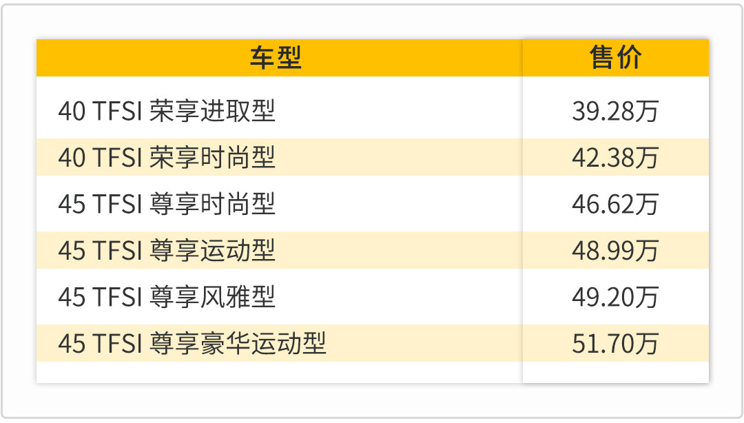 新车推出40TFSI和45TFSI两种动力共计6款车型,售价为39.28-51.70万元。
