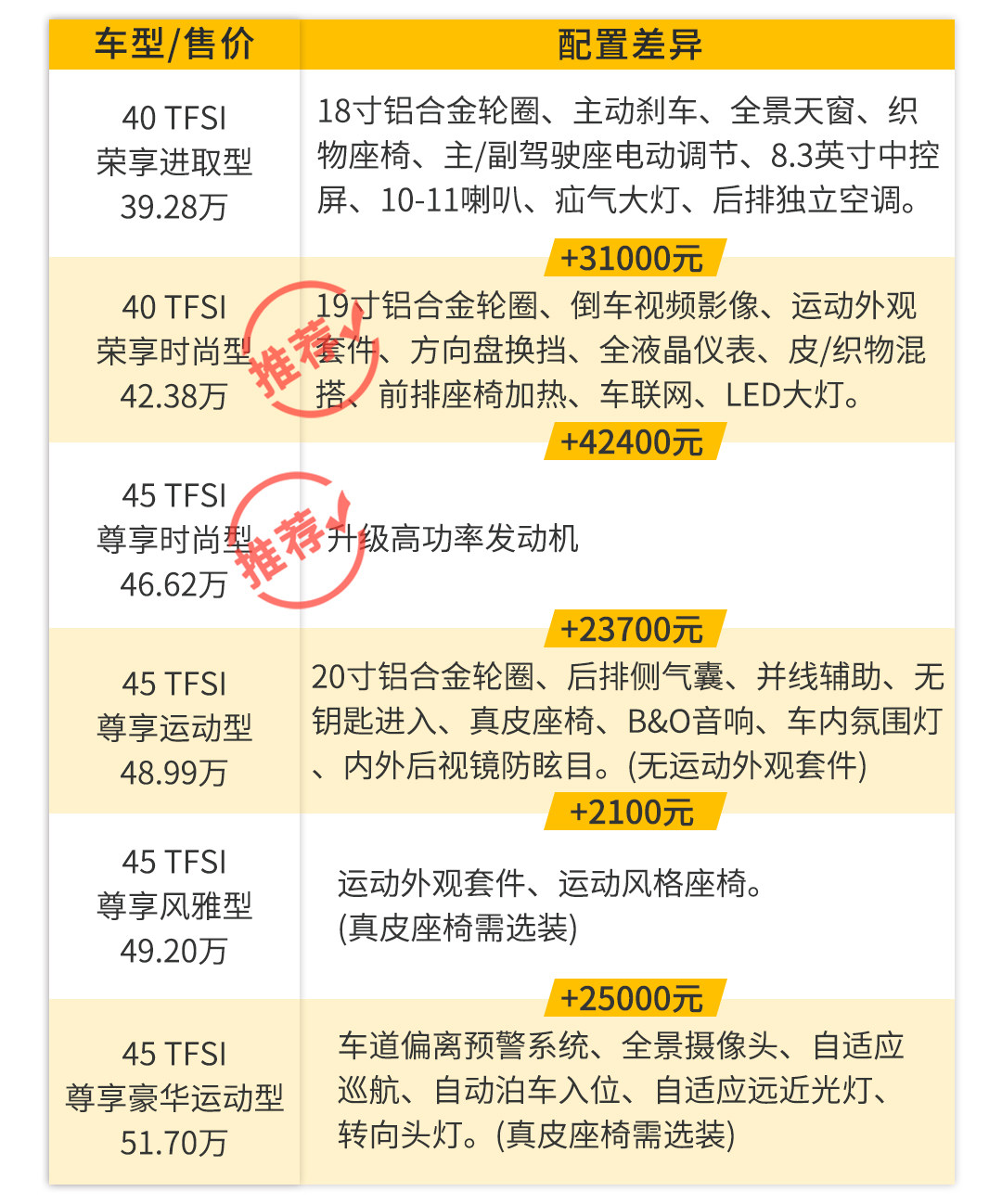 40TFSI共有两款车型,45TFSI则有四款车型,首先不必考虑的是最低配车型,因为有许多本车型的特色配置都没有配备,或需要选装。而次低配车型则将最低配车型的大部分不足都弥补了,虽然加了3.1W的价钱,但其配置还是物有所值的。