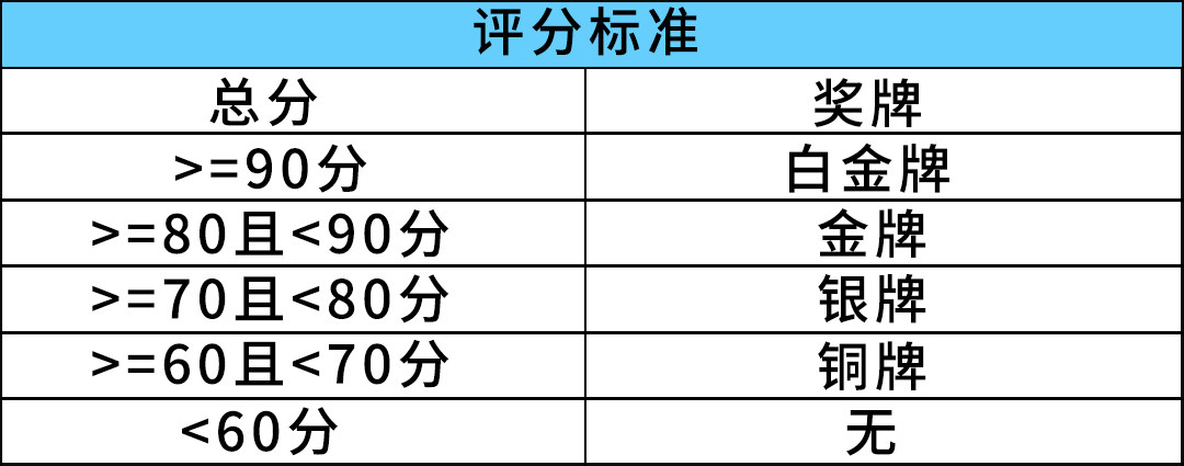 根据具体的指标得分,C-ECAP的结果将通过奖牌来体现,如果得分小于60分,则没有奖牌,如果大于等于90分,则获得白金牌,详细情况请见下表: