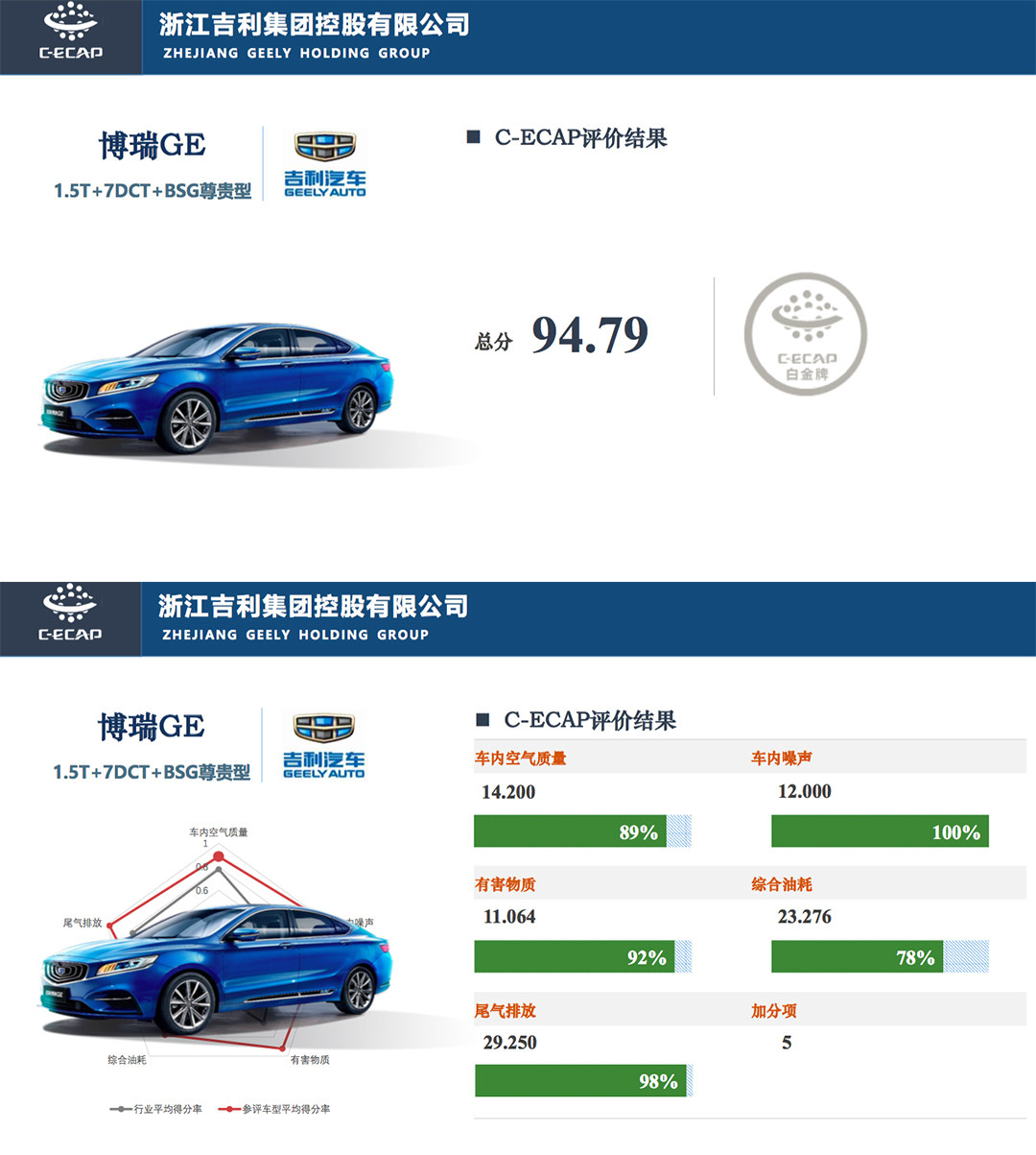 难得的是,博瑞GE在此次测试评价中获得94.79的高分,比高尔夫嘉旅高出近5分。从细分成绩来看,车内噪声一项获得满分,尾气排放、有害物质以及车内空气质量也接近满分,仅综合油耗表现这一项略微失分。总体来看,博瑞GE的表现较为优异,这也是获得白金牌评价的关键。
