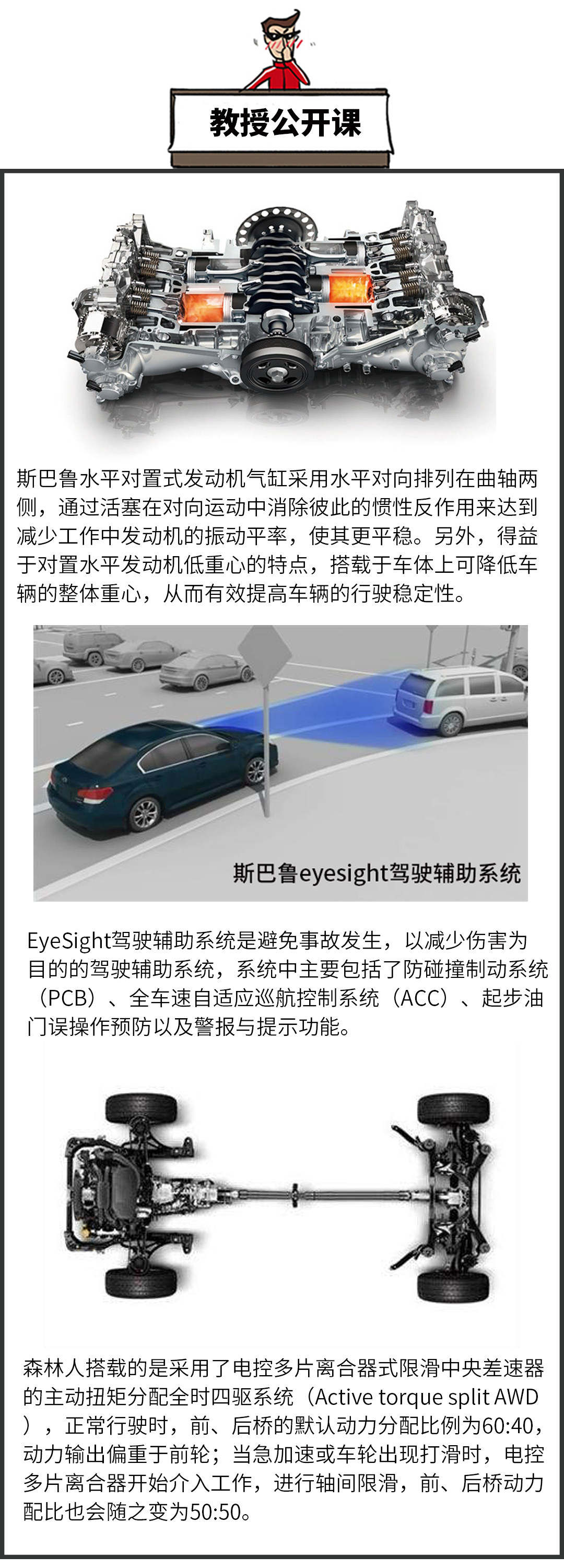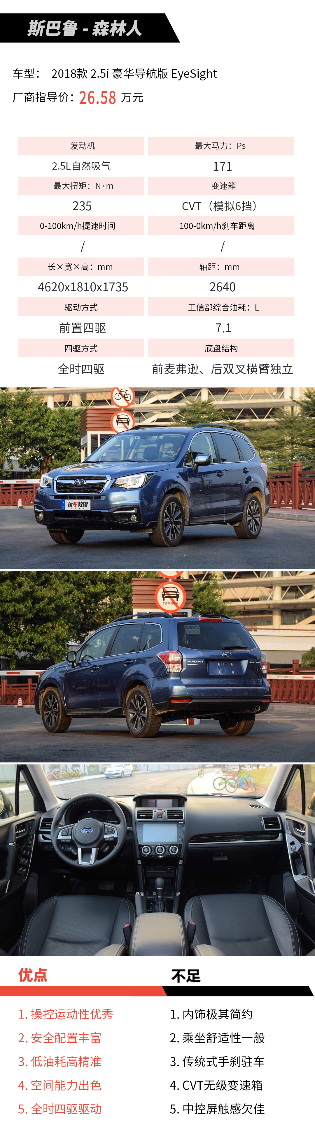 作为进口越野型SUV,森林人除了越野性出众外,安全配置也足够丰富,独有的左右对称全时四驱系统在消费者中也拥有很高的认可度,与四驱系统配套的X-MODE行车模式,可改变电子限滑判断逻辑,显著增强电子限滑的介入速度,使整车四驱系统反应更为迅速。不过,水平对置发动机虽为车辆带来了更好的操控性,随之而来的缺点相对来说也比较明显,机油润滑等问题比较难解决,后期维修保养也不是那么方便。