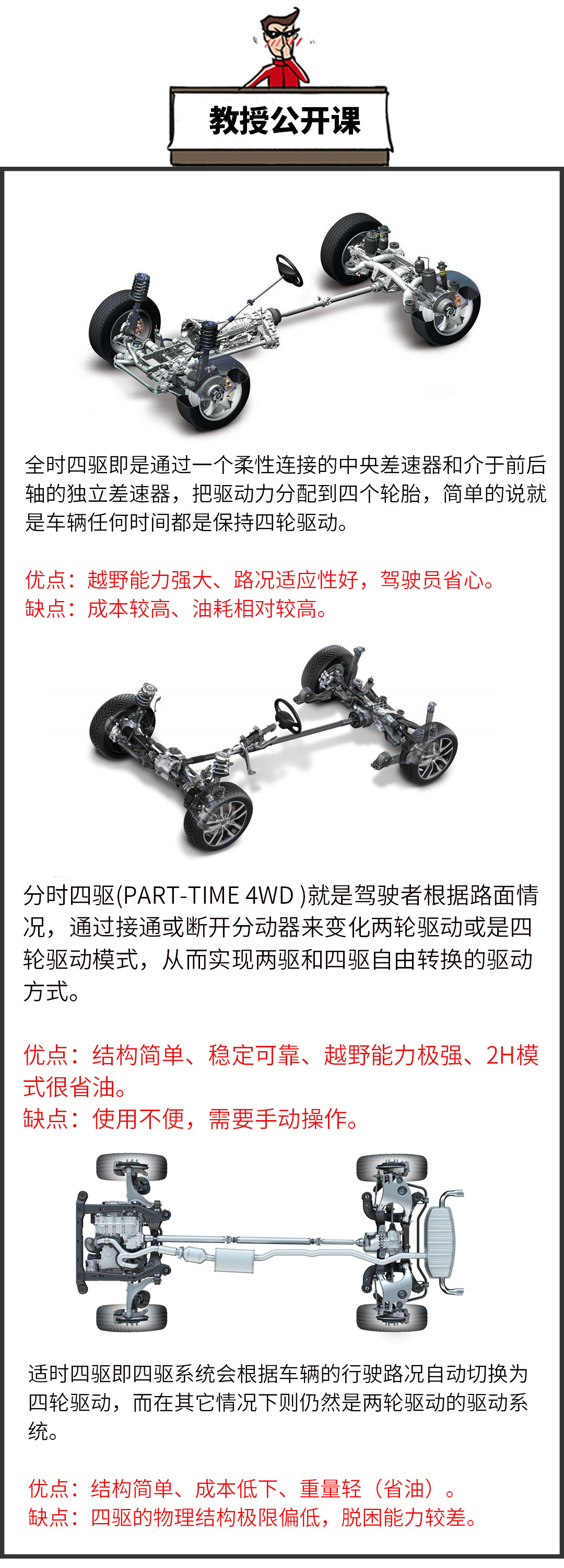 SUV自出道就凭借其出色的空间和通过性能深受消费者喜爱,近些年随着生活水平的提高,人们对SUV四驱越野性能的关注度也是不断的提高,然而真的说到买四驱车时全时四驱、适时四驱、和分时四驱就让不少消费者蒙圈了,这怎么选?不知道不要紧,赶紧接着往下看▼