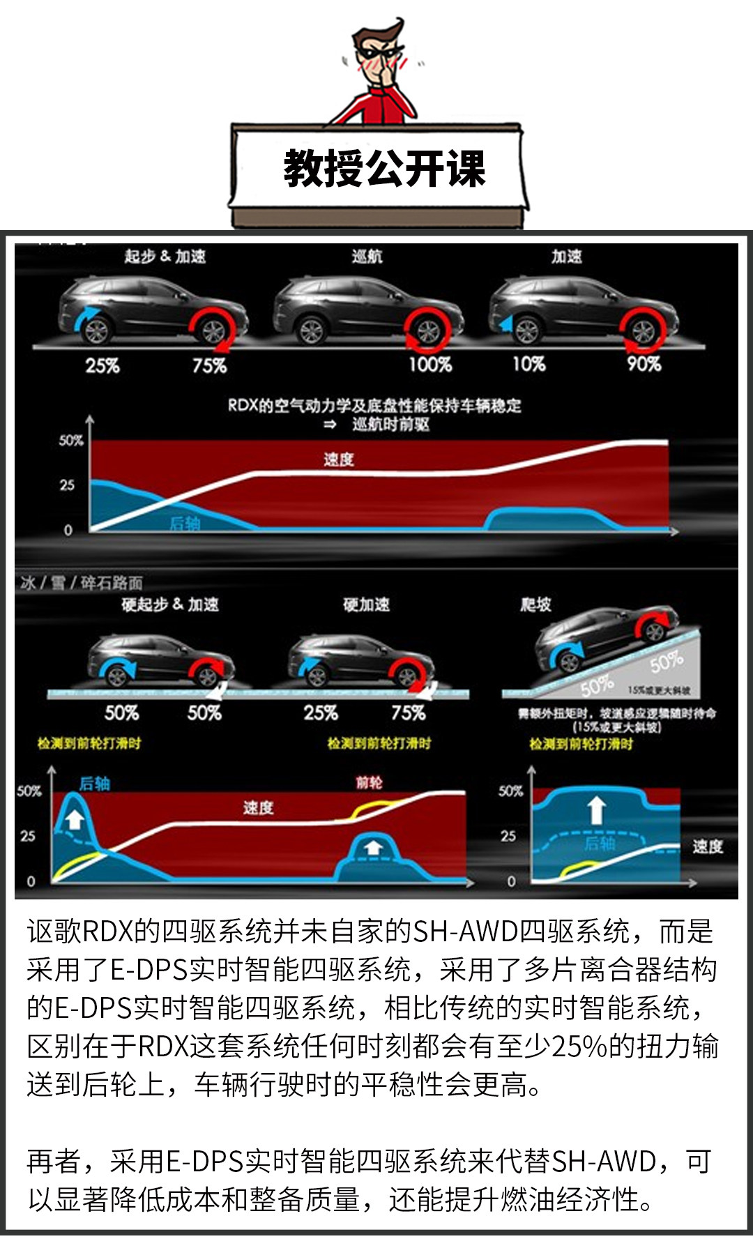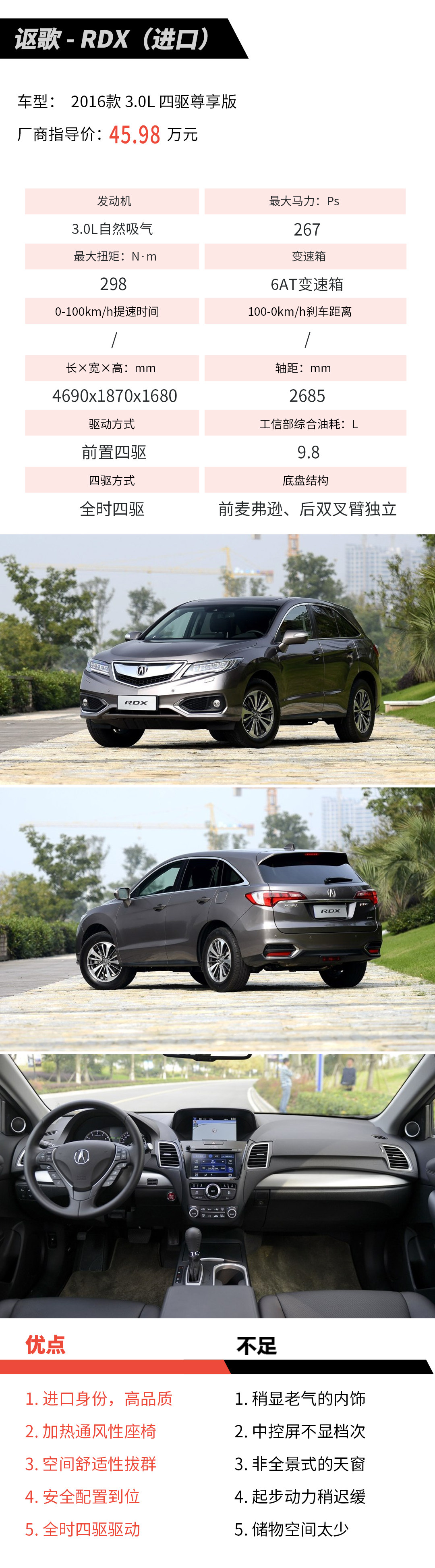 讴歌RDX算是款表现比较均衡的车,不论是动力、配置、还是空间舒适性都不错,没什么明显的缺点。值得一提的是RDX底盘通过使用铸铝合金零部件降低了车辆的簧下质量后,车辆的操控和运动性能有了明显的提升。然而,RDX全时四驱系统只有顶配版车型才有,这稍微有点遗憾。