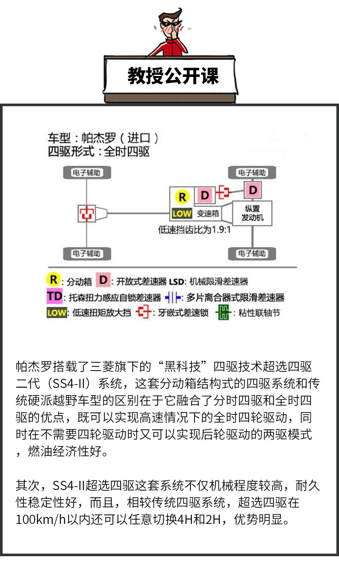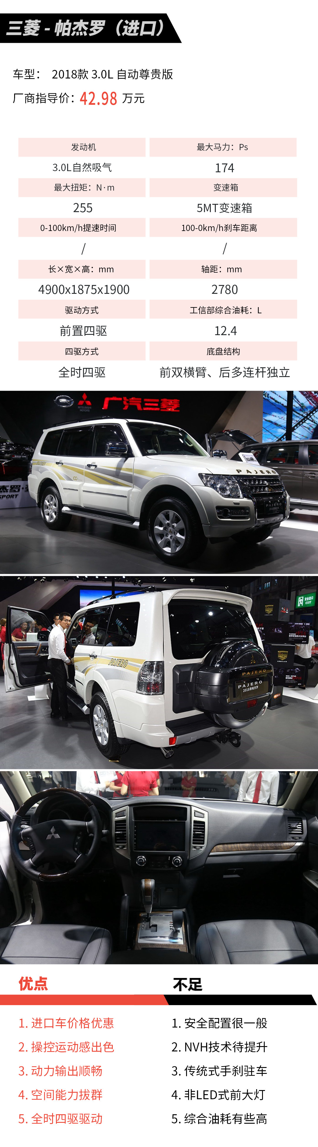 帕杰罗全系搭载采用了SOCH技术的3.0L引擎和代表三菱尖端四驱技术的超选四驱二代(SS4-II)系统,相比传统硬派越野车型帕杰罗还多出了两驱模式,对提升车辆的燃油经济性具有很大的作用。总的来说,帕杰罗集大排量发动机、一体式承载车身、超选四驱等优点于一身,加之新款车型在内饰和配置上的改进,帕杰罗在全能高端性能SUV领域中始终占有不可抗拒的地位。