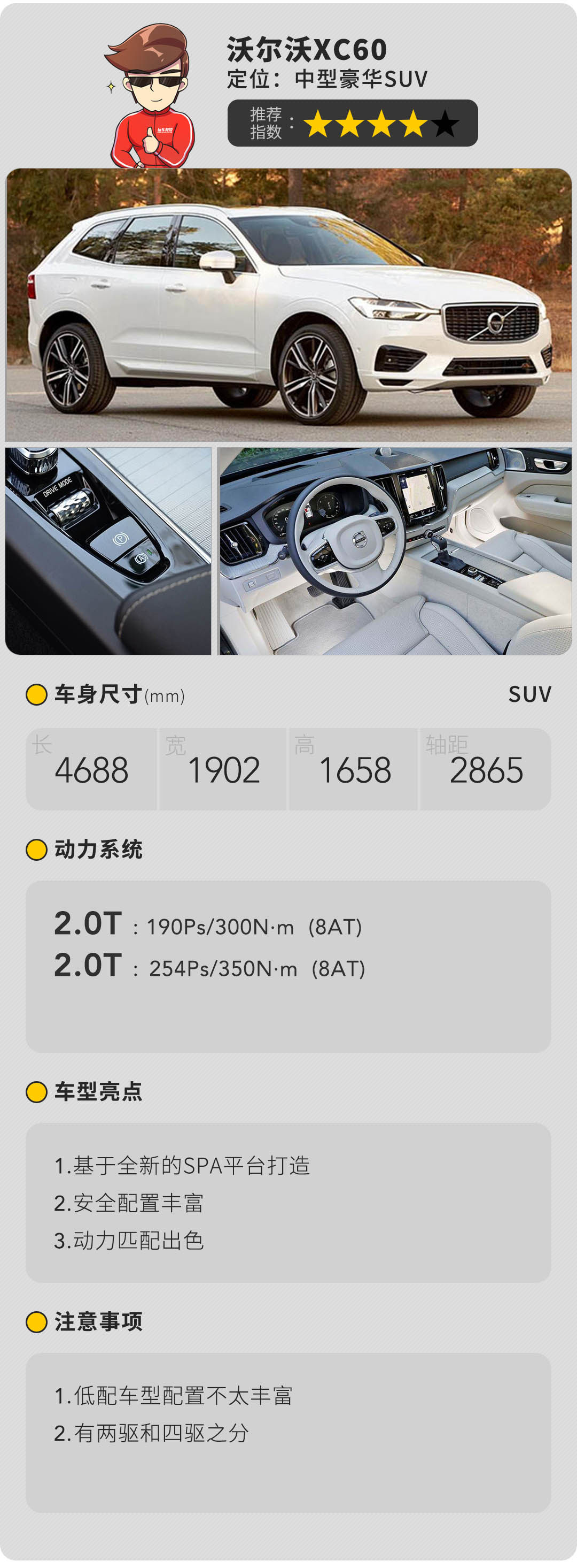 全新的沃尔沃XC60采用了SPA模块化平台,在这个架构上,不论是车辆的大小及复杂性,都可以建在同一条生产线上。新车共搭载了T4、T5两种种不同动力组合,未来还有可能搭载T8系列发动机。其中,T8为插电式混合动力高性能发动机。