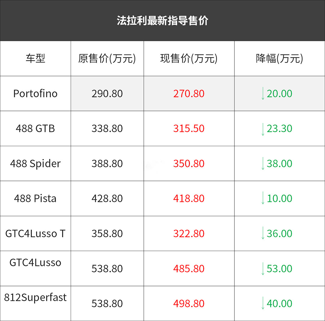 日前从法拉利官方了解到,法拉利针对旗下全系车型实施官降,降价幅度区间为10-53万元。其中法拉利GTC4Lusso的降幅最大,达到53万元。随着国家关税政策调整,法拉利终于公布了它的官降幅度,对持币待购的车主而言是个不错的消息。
