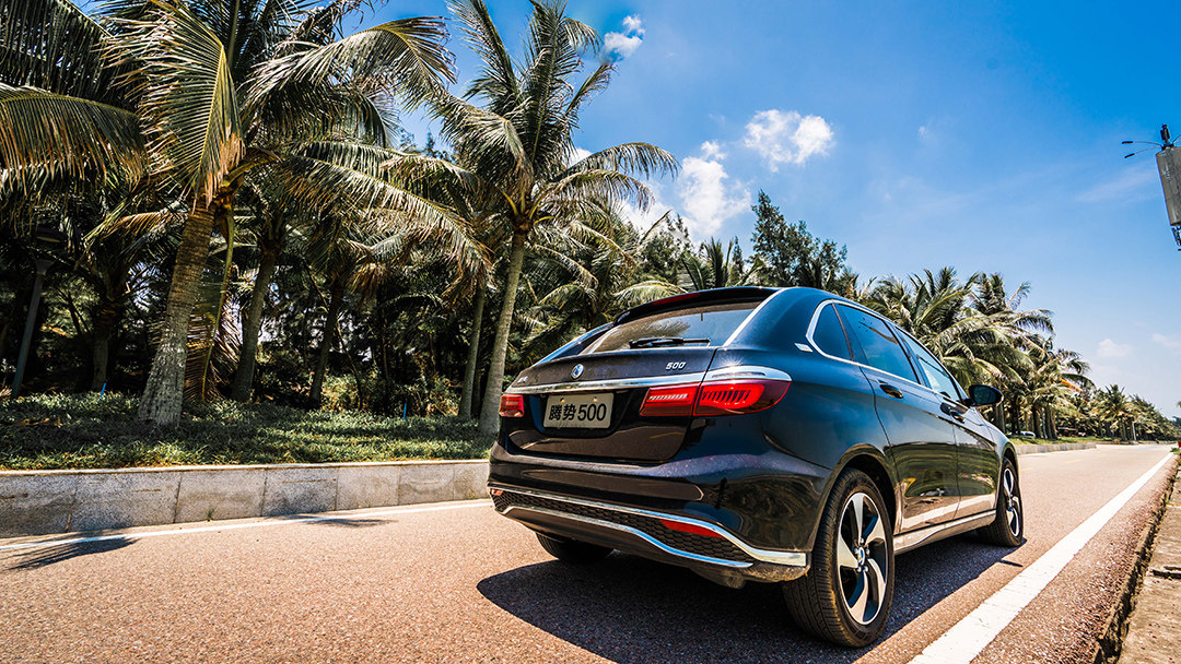 来到车尾,感觉稍显突兀。腾势500的尾窗向内凹陷,在尾箱出挤出了一个平台,而且它的后备箱门没有像两厢车那样采用掀背设计,从严格意义上来说,它实际上是一款三厢车。这也是腾势500备受争议的地方,至于好不好看,就见仁见智了。
